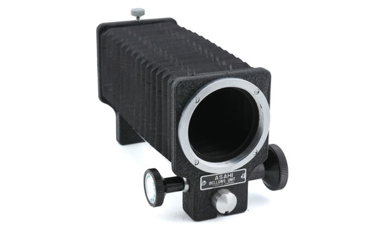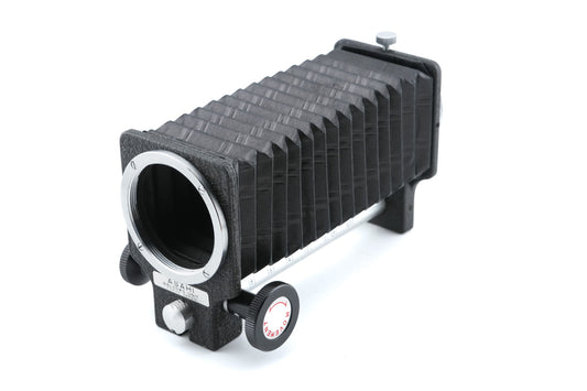 Macro bellows extension made for M24 mount SLR lenses by Pentax. Allows a magnification of 2.2x with a 50mm lens when fully extended. Metal body available in black.
