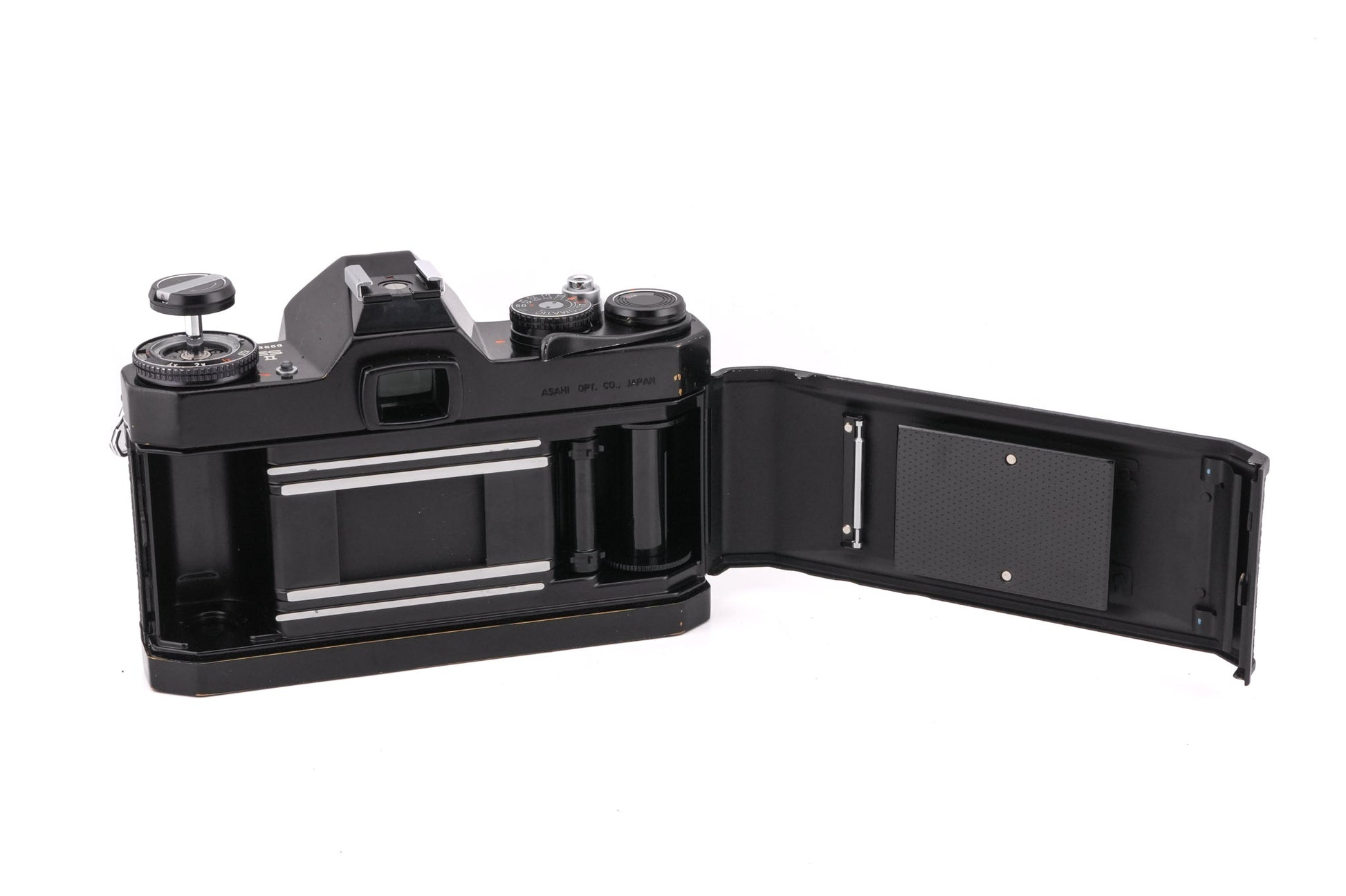 Manual focus M42 screw mount 35mm SLR camera introduced by Pentax in 1973. It introduced a self-timer and reduced power requirements but remained similar in appearance to the earlier ES. Metal body available in black and silver.