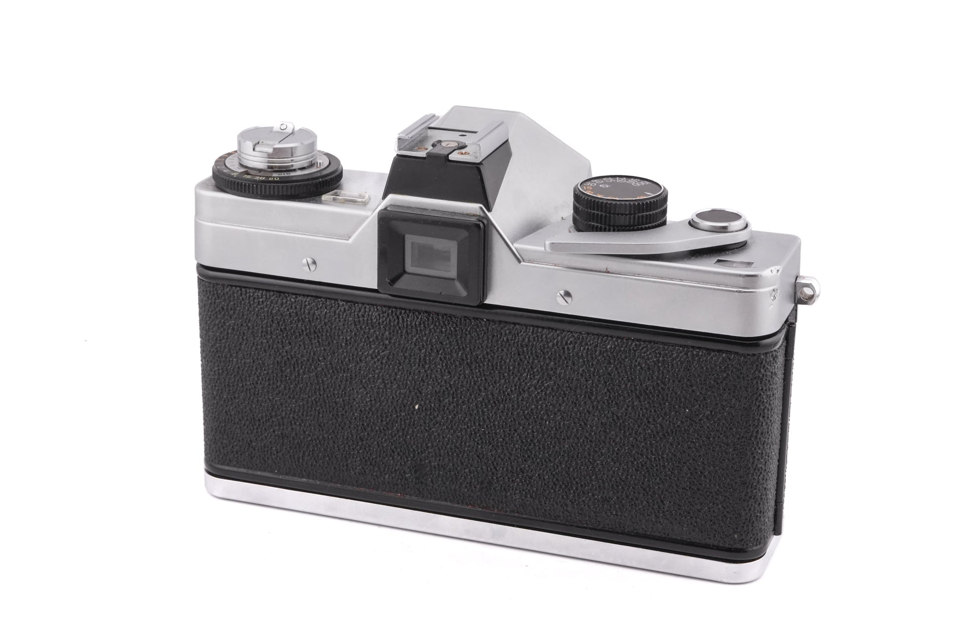 Manual focus M42 screw mount 35mm SLR camera introduced by Praktica in 1972. It has a selenium cell light meter. Metal body available in silver.