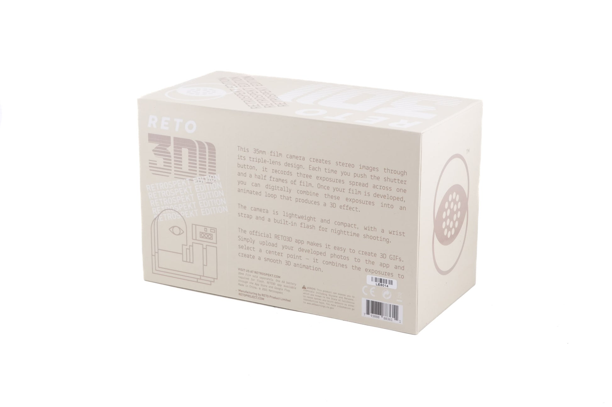Fixed focus triple-lens 35mm camera released by Reto. It's meant to be used alongside their companion app to make GIFs with a "wiggle" effect created by the three different perspectives of the same scene. This is a special edition produced for Retrospekt in the US. Plastic body available in beige.