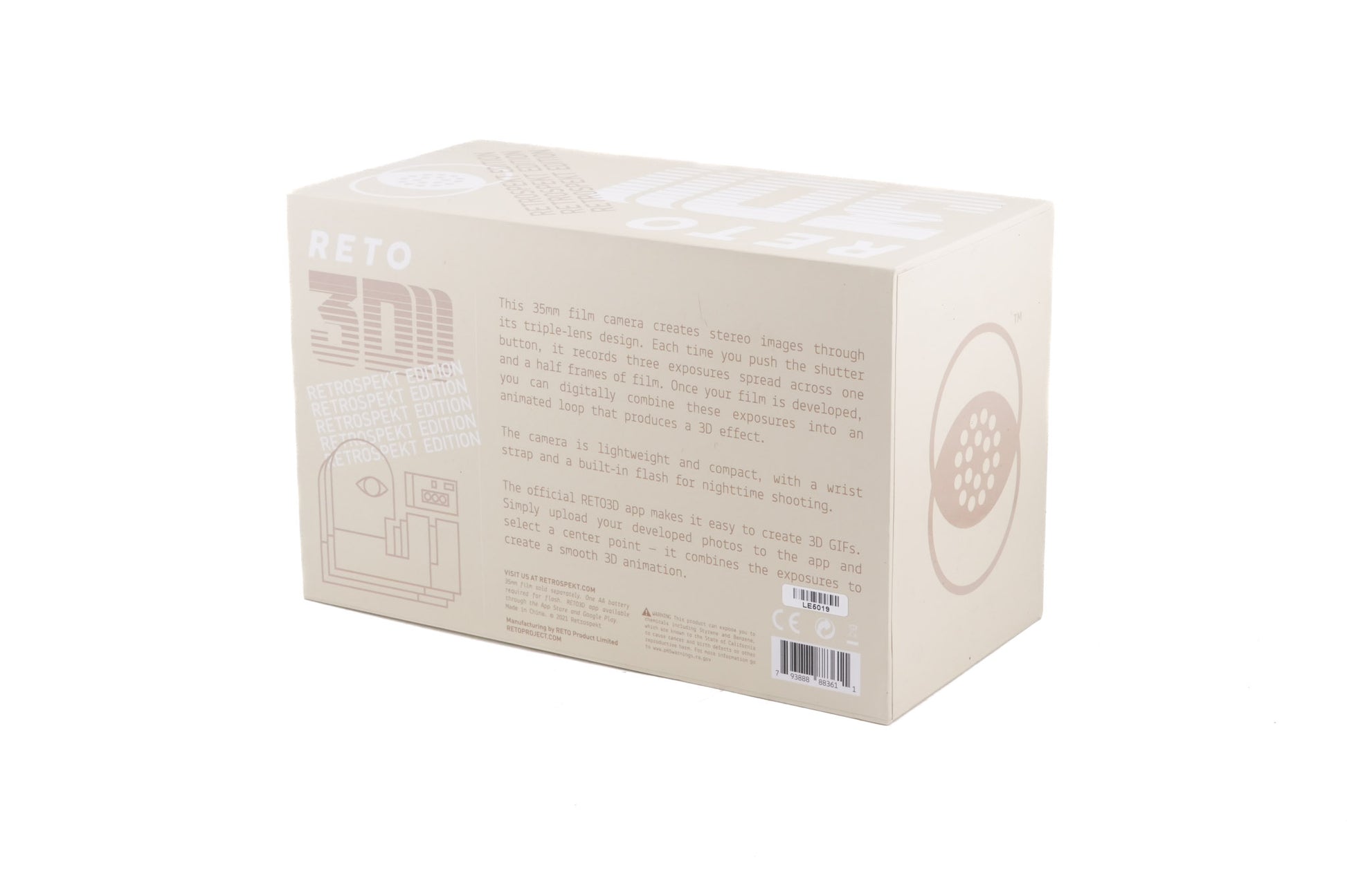 Fixed focus triple-lens 35mm camera released by Reto. It's meant to be used alongside their companion app to make GIFs with a "wiggle" effect created by the three different perspectives of the same scene. This is a special edition produced for Retrospekt in the US. Plastic body available in beige.