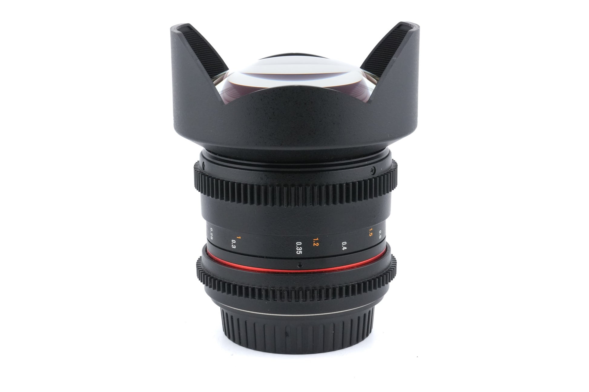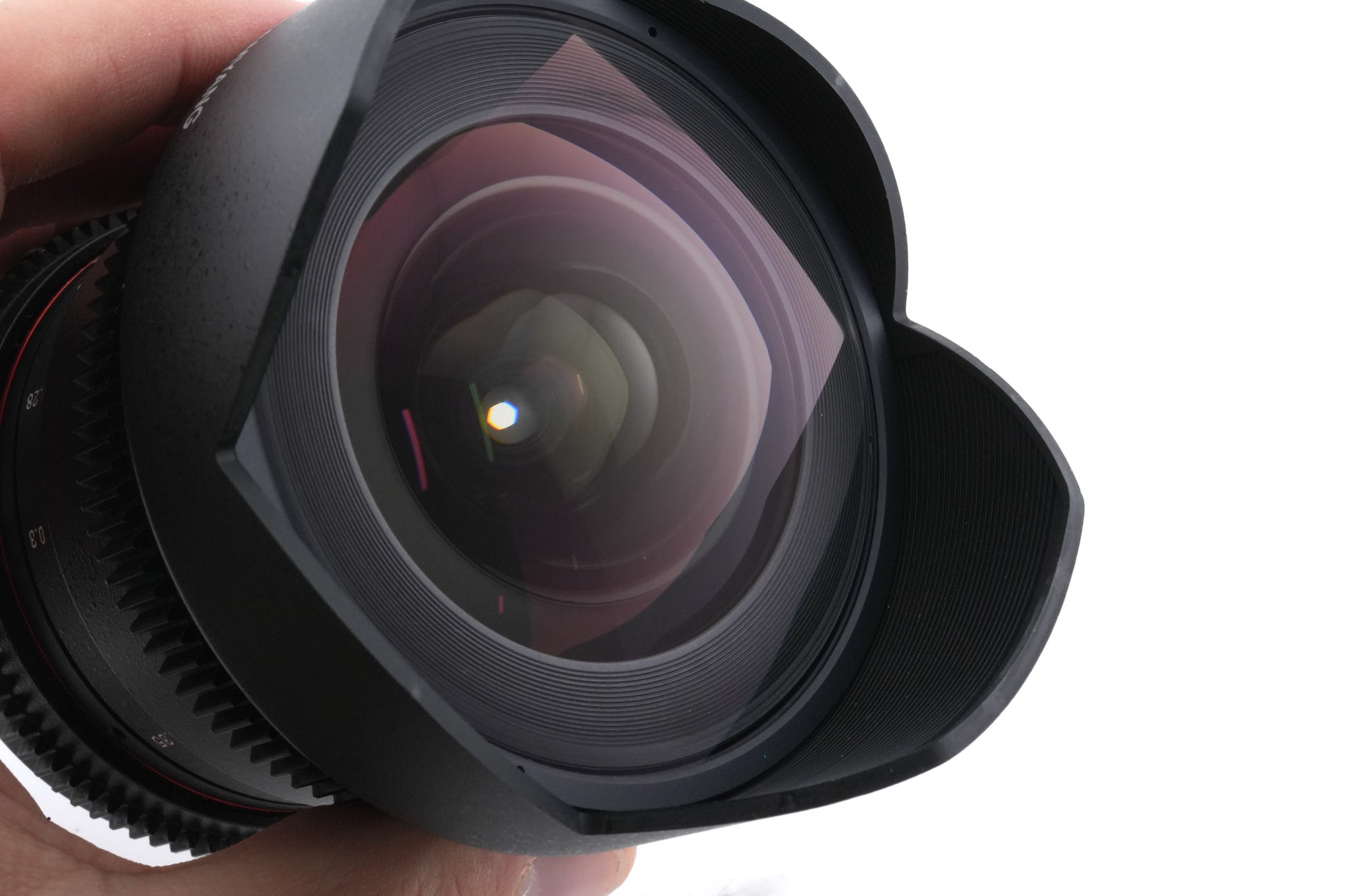 Wide-angle cine lens made for Canon EF mount SLRs and DSLRs by Samyang. De-clicked aperture ring with geared aperture and focusing ring for follow-focus. Lens groups has two ED- and two aspherical lens elements with UMC-multicoating. Metal body available in black.