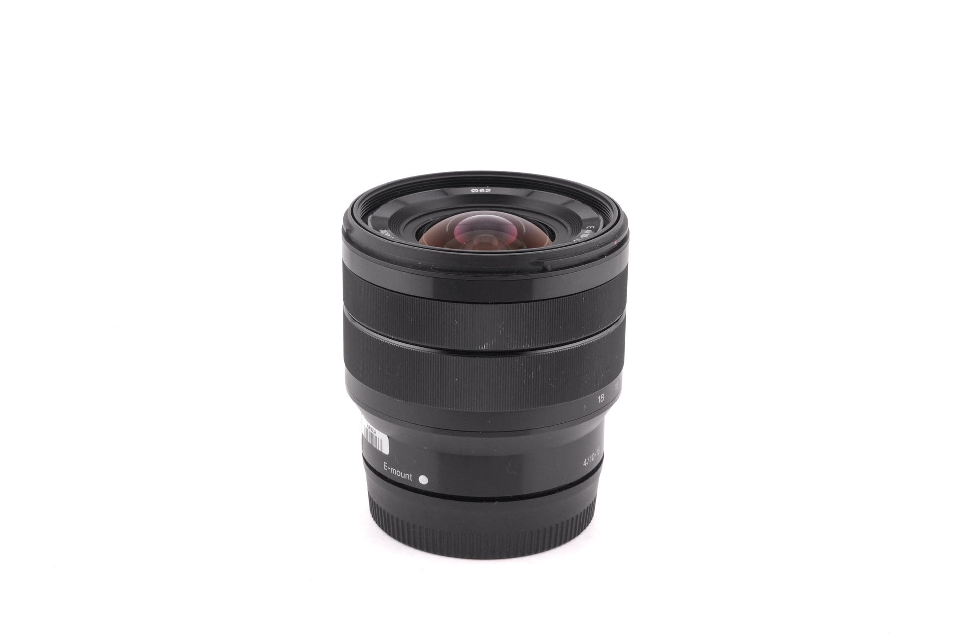 Autofocus wide-angle zoom lens made for E-mount digital mirrorless cameras by Sony. It is designed for APS-C-sized sensors and gives the equivalent field of view to a 15-27mm lens on full frame/35mm. It has an image stabilizer (OSS). The product code is SEL1018. Metal/plastic body available in black.