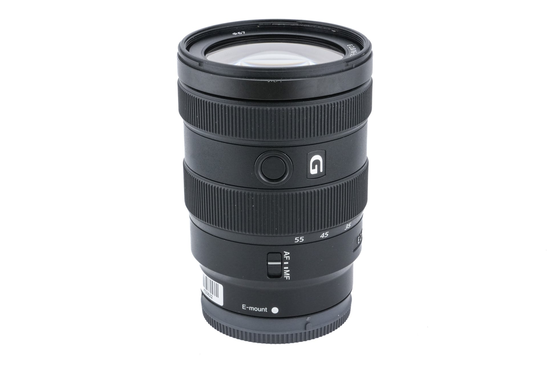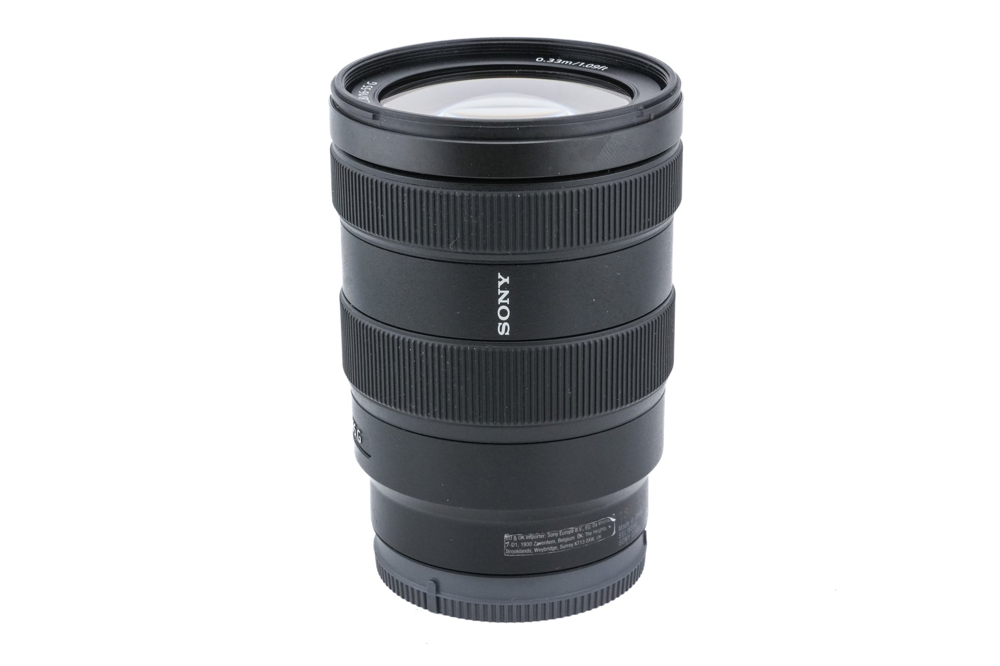 Autofocus wide-normal zoom lens made for E-mount digital mirrorless cameras made by Sony. It is designed for APS-C-sized sensors and gives the equivalent field of view to a 24-82.5mm lens on full frame/35mm. The product code is SEL1655G. Metal body available in black.