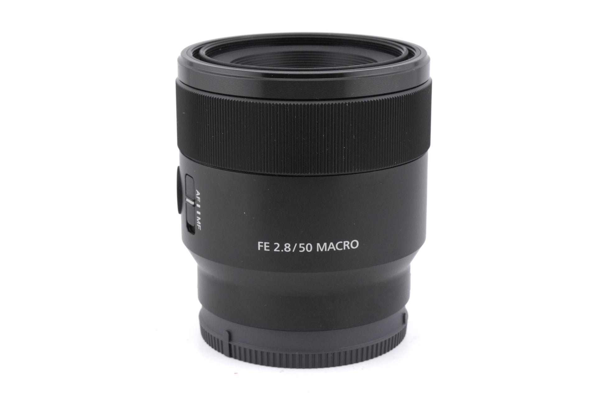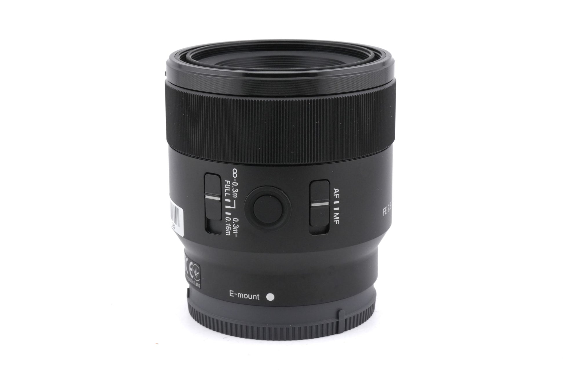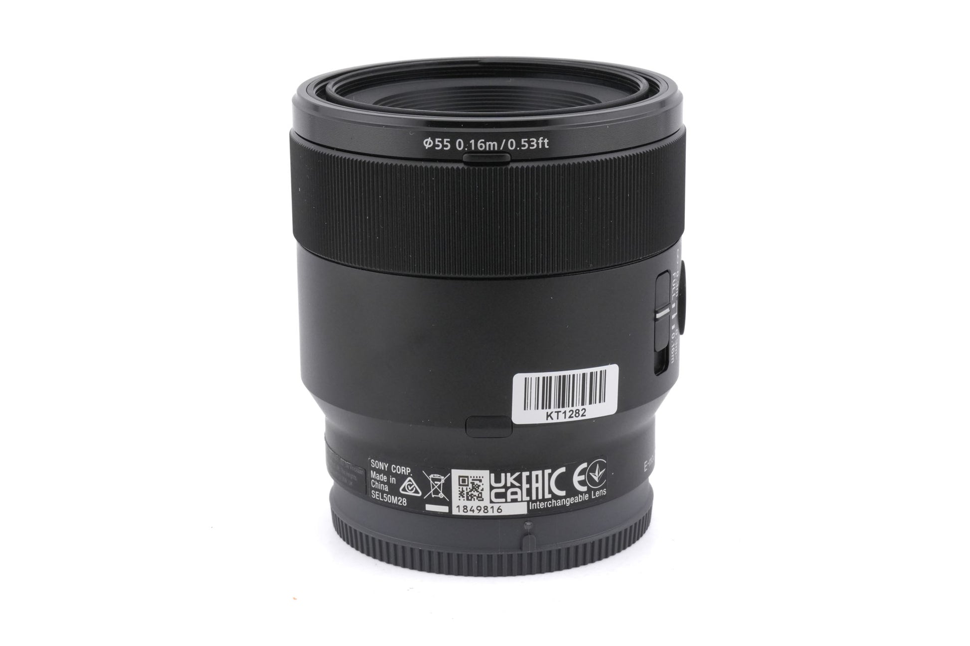 Autofocus macro lens made for FE / E mount mirrorless cameras by Sony. Uses a loose focus system that acts like continuous autofocus and makes fine focusing faster. The product code is SEL50M28. Plastic body available in black.