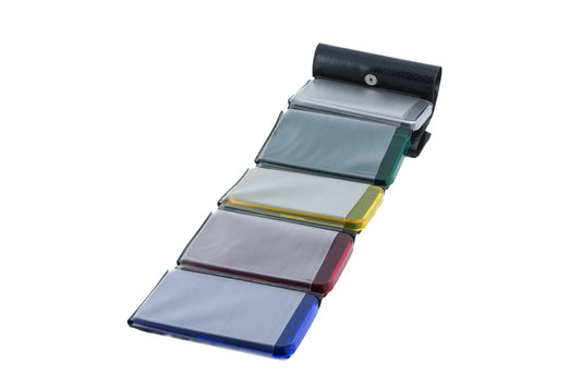Kit of 5 filters made by Starblitz, including red, yellow, blue, green, and neutral wide diffuser filters for compatible Starblitz flashes. Plastic body available in various colors.