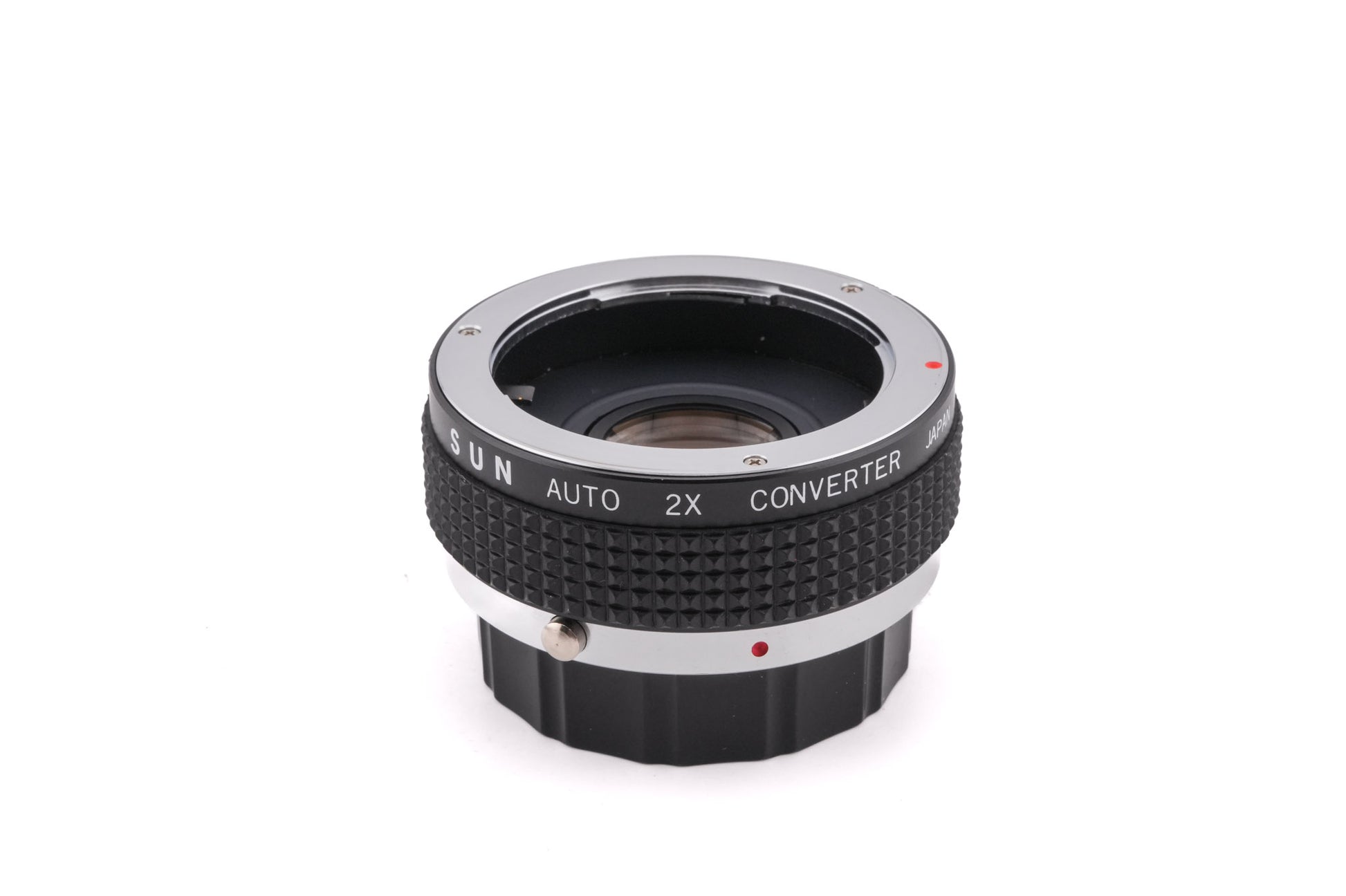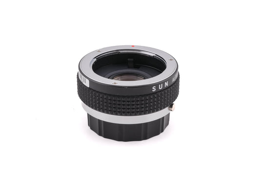 Doubling teleocnverter for Olympus OM-mount cameras and lenses made by Sun. It doubles the focal length of the lens at the cost of some light. Black and chrome metal body with rubberized grip.