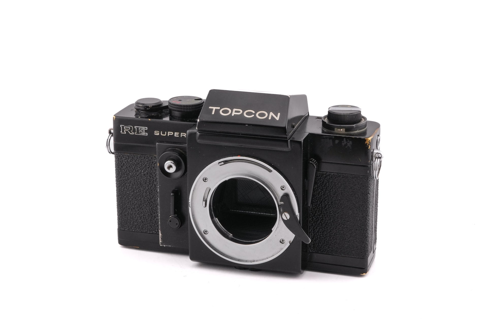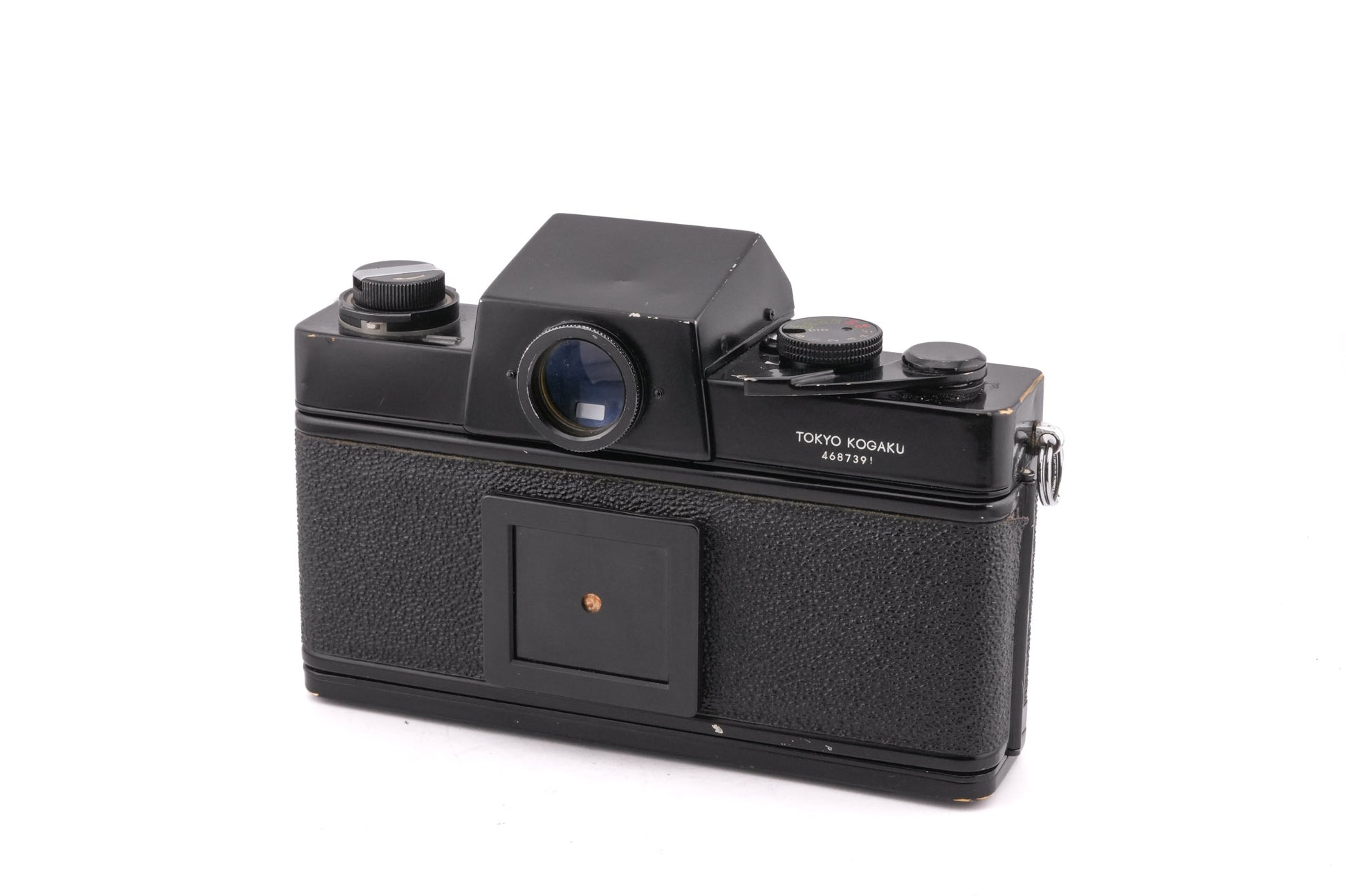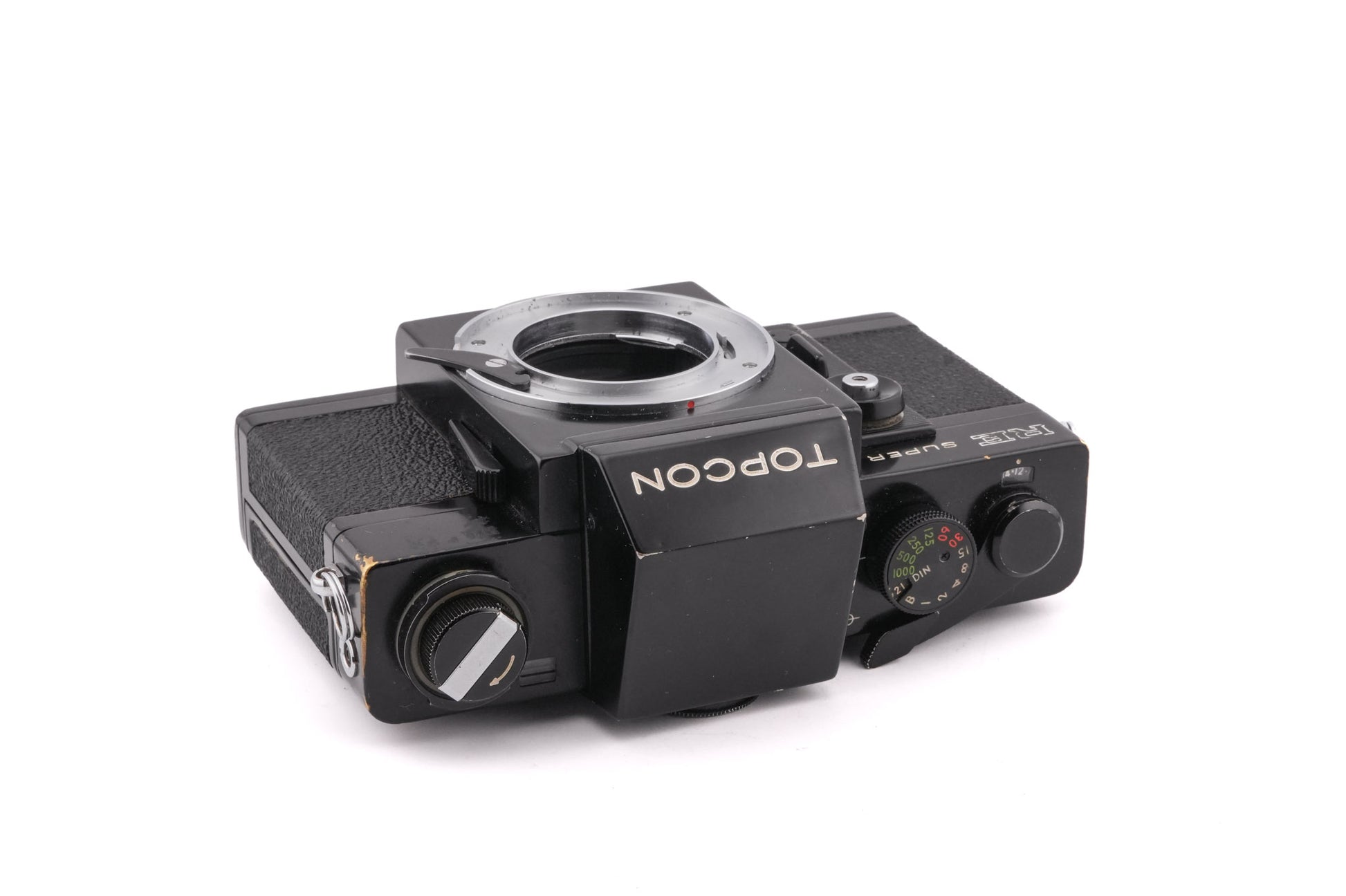 Manual focus 35mm Topcon/Exakta-mount 35mm SLR camera released by Tokyo Kogaku KK in 1963. It is also known as the Beseler Super Topcon D (NA). This camera was selected by the US Navy as their SLR of choice over the Nikon F and other SLRs of the time. Features motor drive support and interchangeable finders. The light meter requires a mercury battery. Metal body available in silver & black.