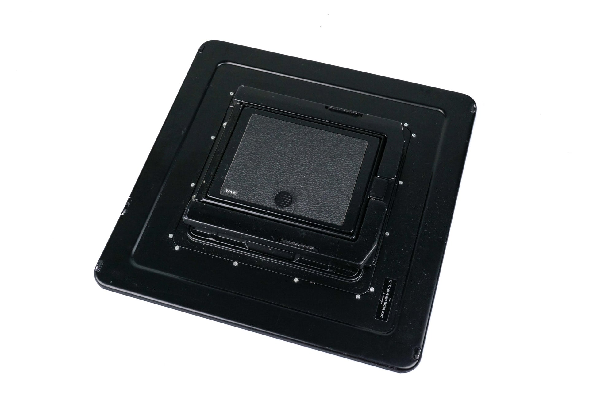 Film back made for the Toyo 810M by Sakai Special Camera Manufacturing. It has ground glass and can accept standard 4x5 film backs. Metal body available in black.