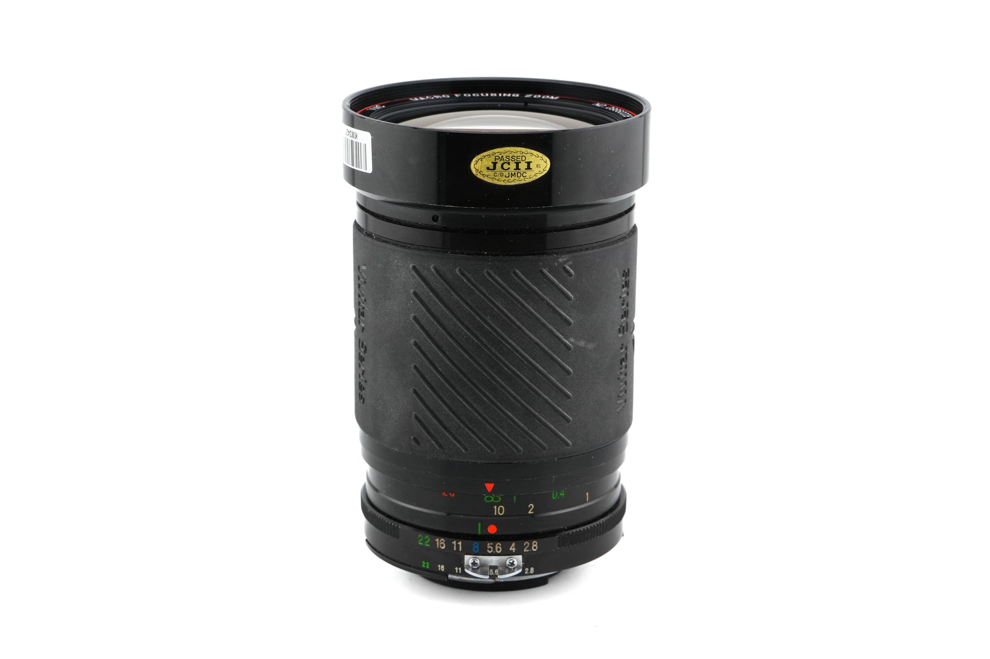 Manual focus wide-telephoto zoom lens for Nikon F-mount 35mm SLR camera made by Vivitar. Metal cnstruction available in black.