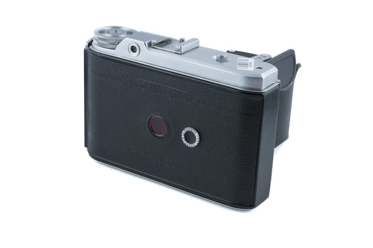 Manual focus 120 folding camera released by Voigtländer in 1950. Features no focusing aid. Metal body available in silver.