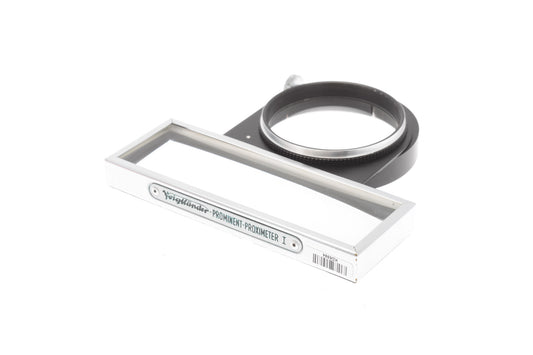 Close up lens with a glass element for the viewfinder compensation as well. Made for the Voigtländer Prominent system lenses that have a outer lens barrel end diameter of ~47mm. Metal construction with silver and black finish.