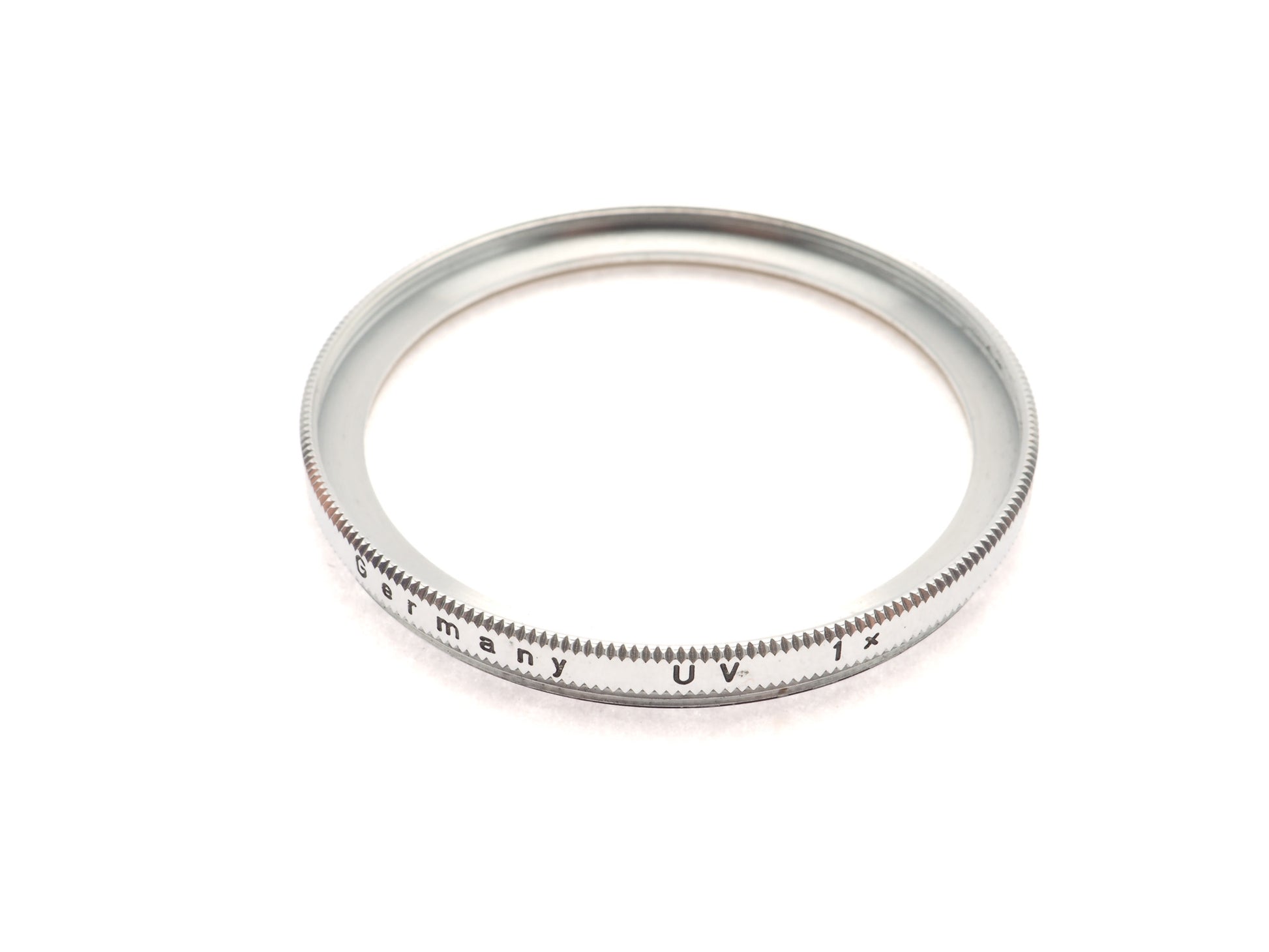 40.5mm UV filter from Zeiss Ikon. Metal frame in a chrome/silver finish, with knurling on the edges for grip.