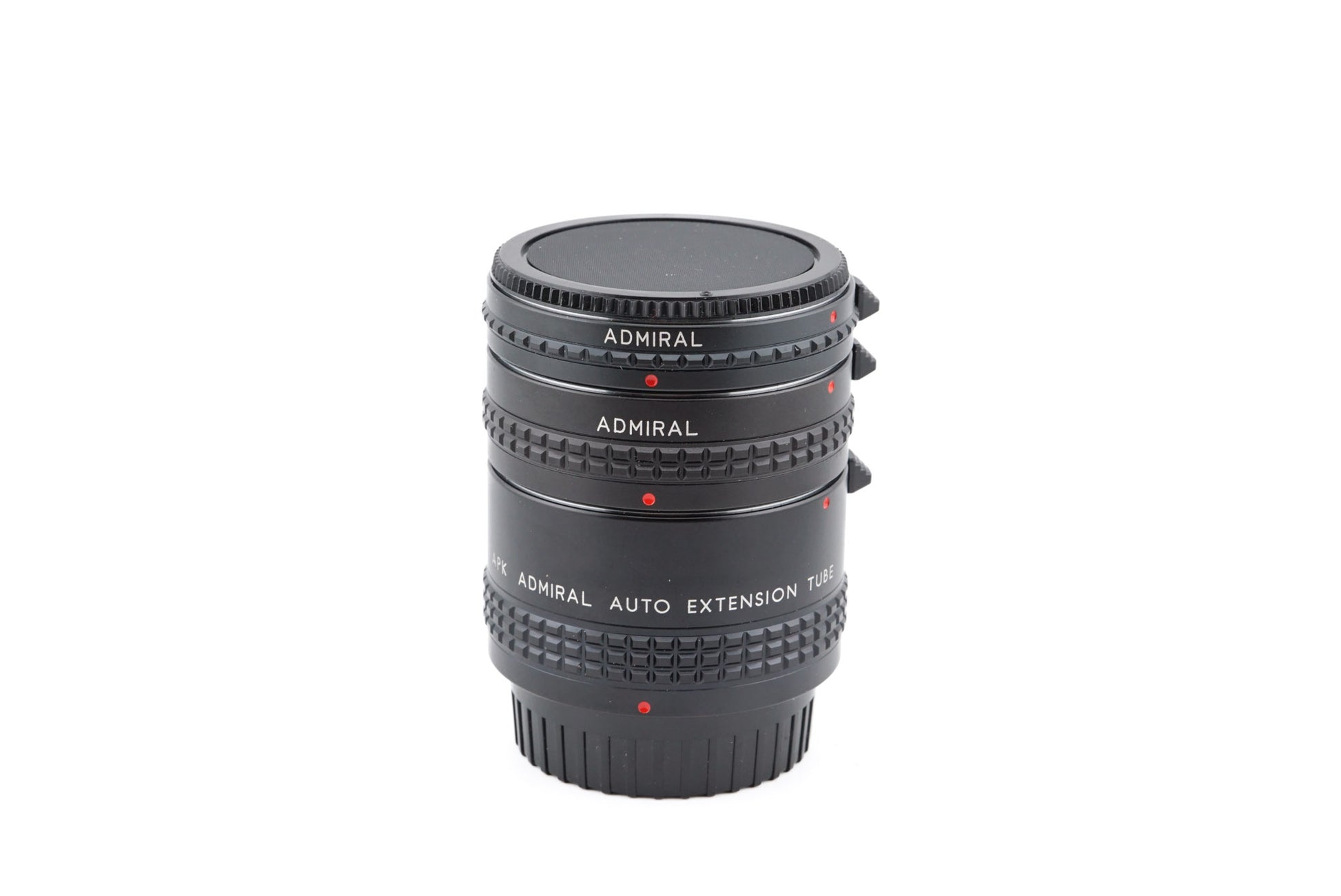 Set of extension tubes made for Pentax K mount SLR cameras by Admiral. Consists of three tubes: 12mm, 20mm, and 36mm. Metal and plastic body available in black.