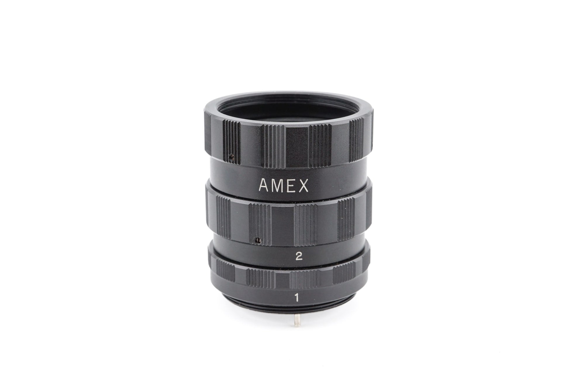 Extension tube set made for M42 screw mount lenses by Amex. A set of three tubes labeled 1, 2, and 3. Has auto aperture pass-through. Metal body available in black.