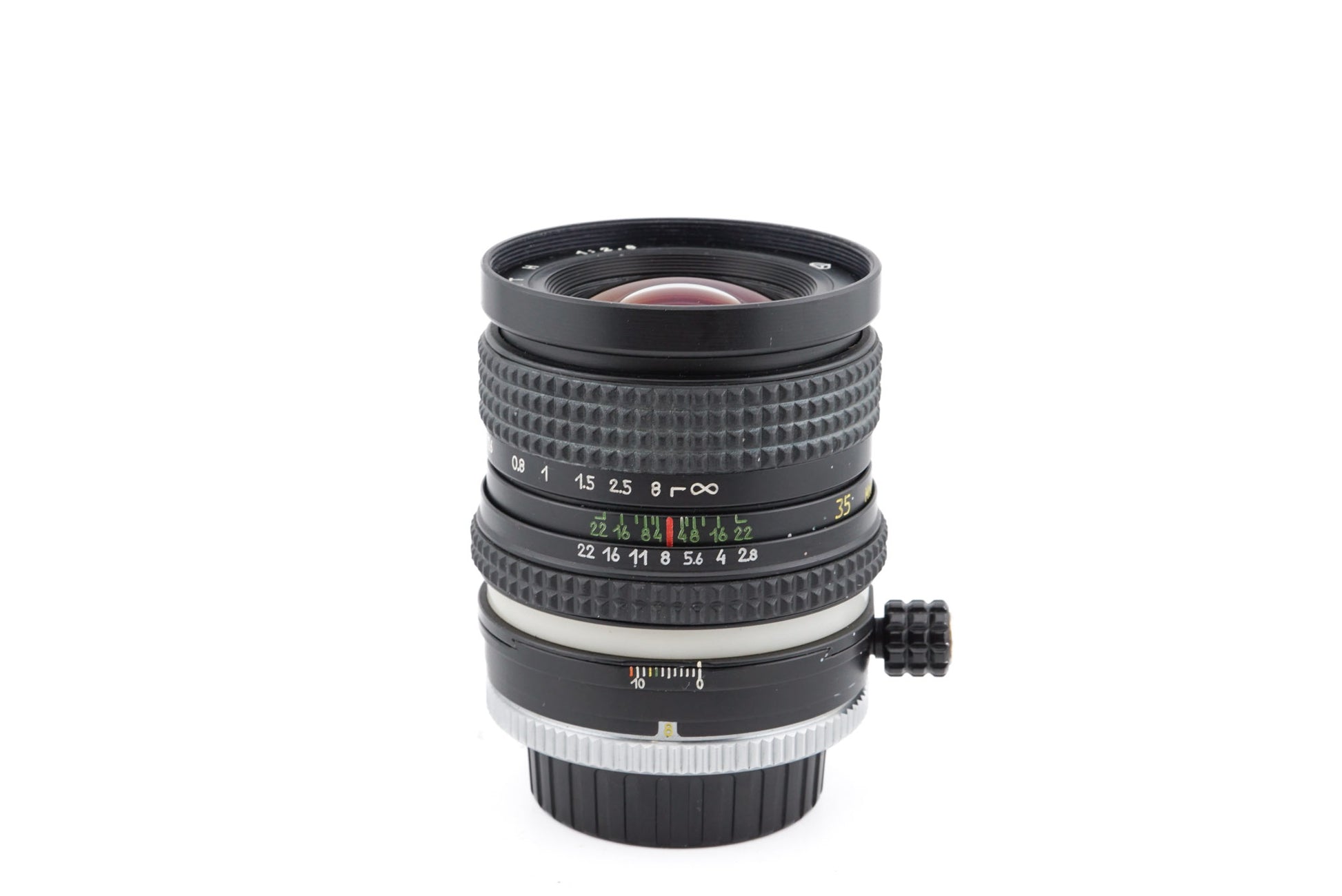 Manual focus semi-wide angle perspective control prime lens made for Nikon F mount SLR cameras made in Ukraine by Arsat. Can shift up to 11mm and turns at the base. Does not have a tilt function. Metal body available in black.