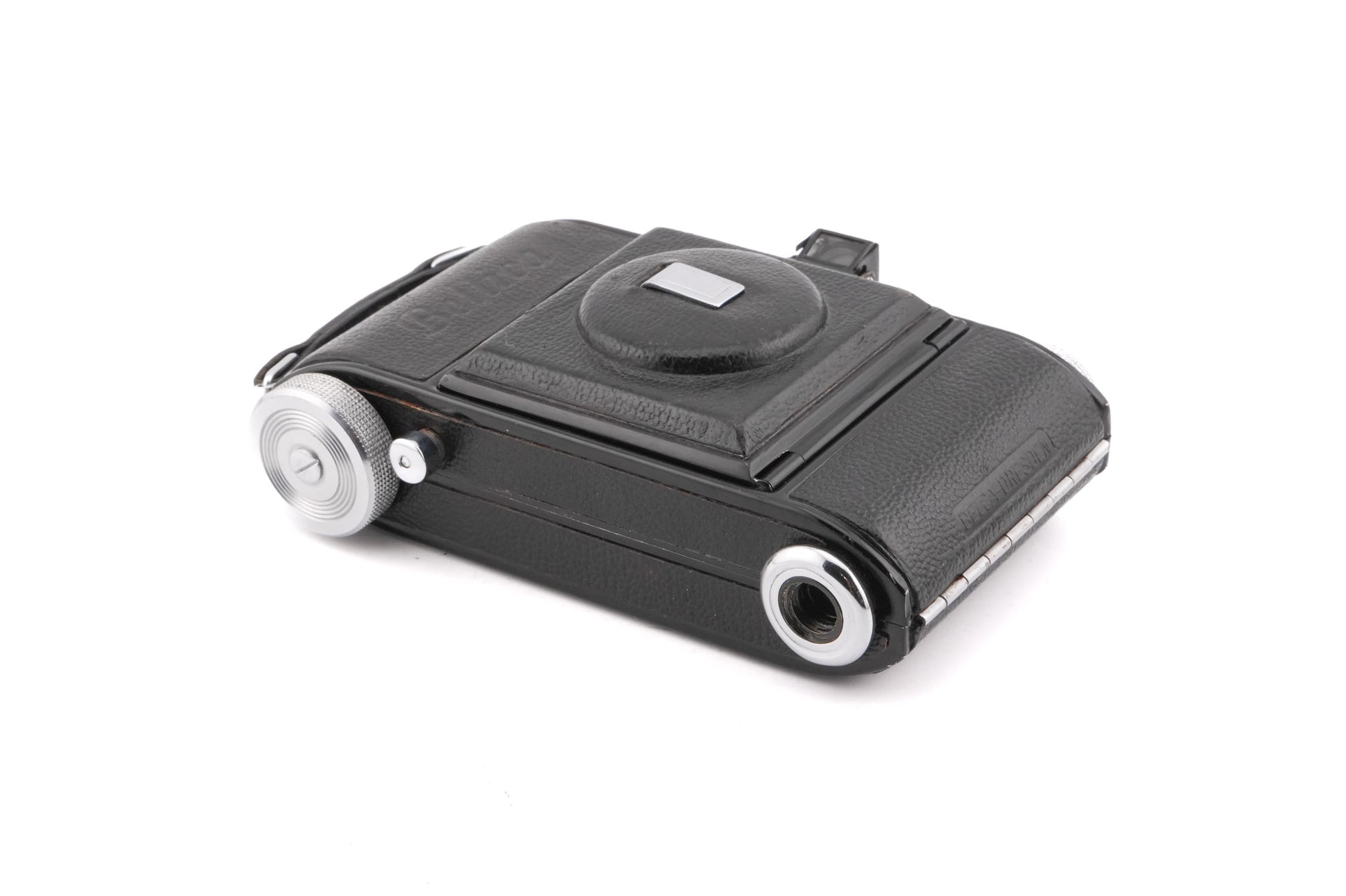 Manual focus 35mm folding camera made by Belca in 1951. Metal construction availbable in black.