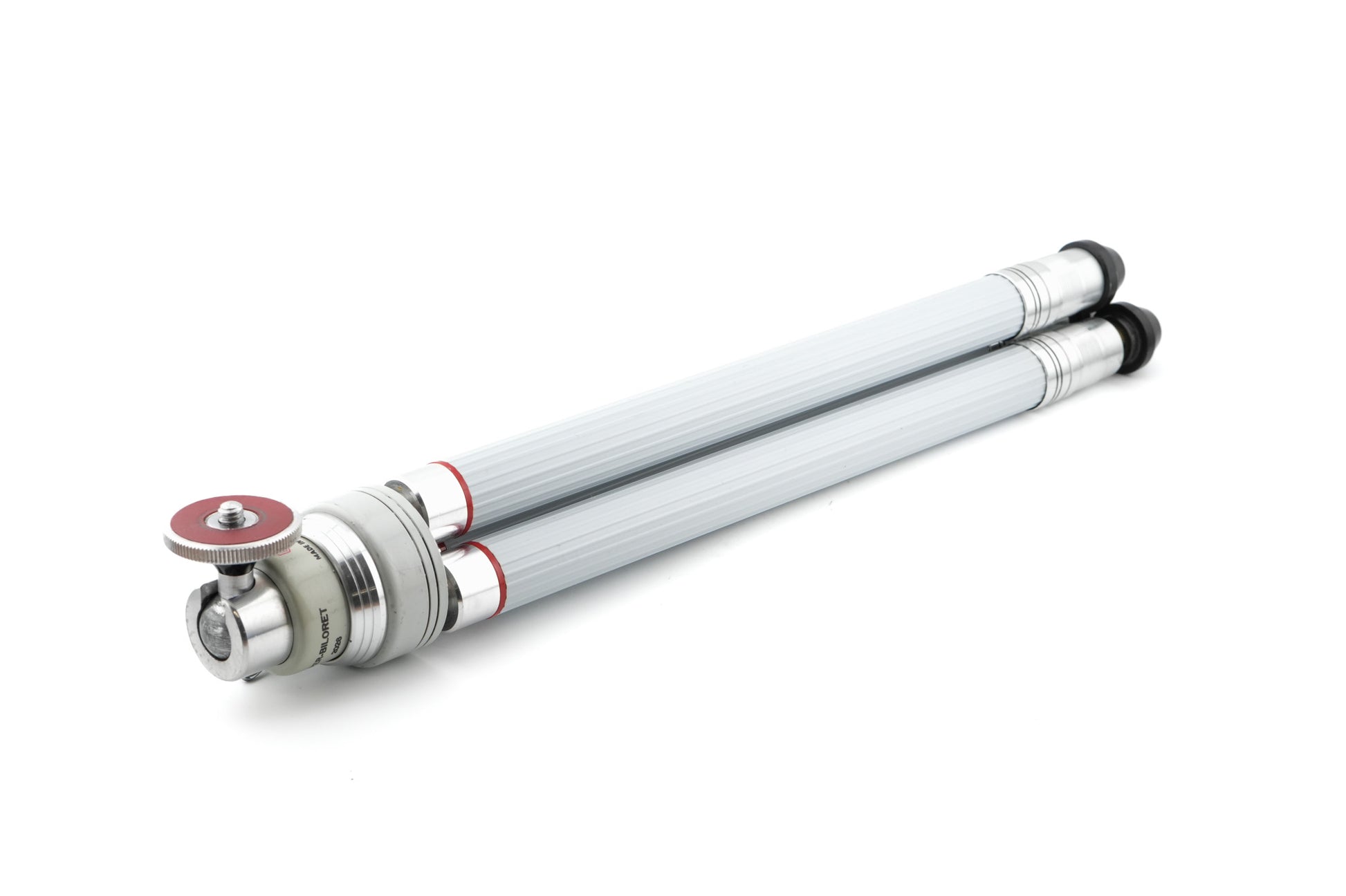 Tripod for camera bodies and accessories with 1/4" threads made by Bilora. Metal construction available in gray with red accents.