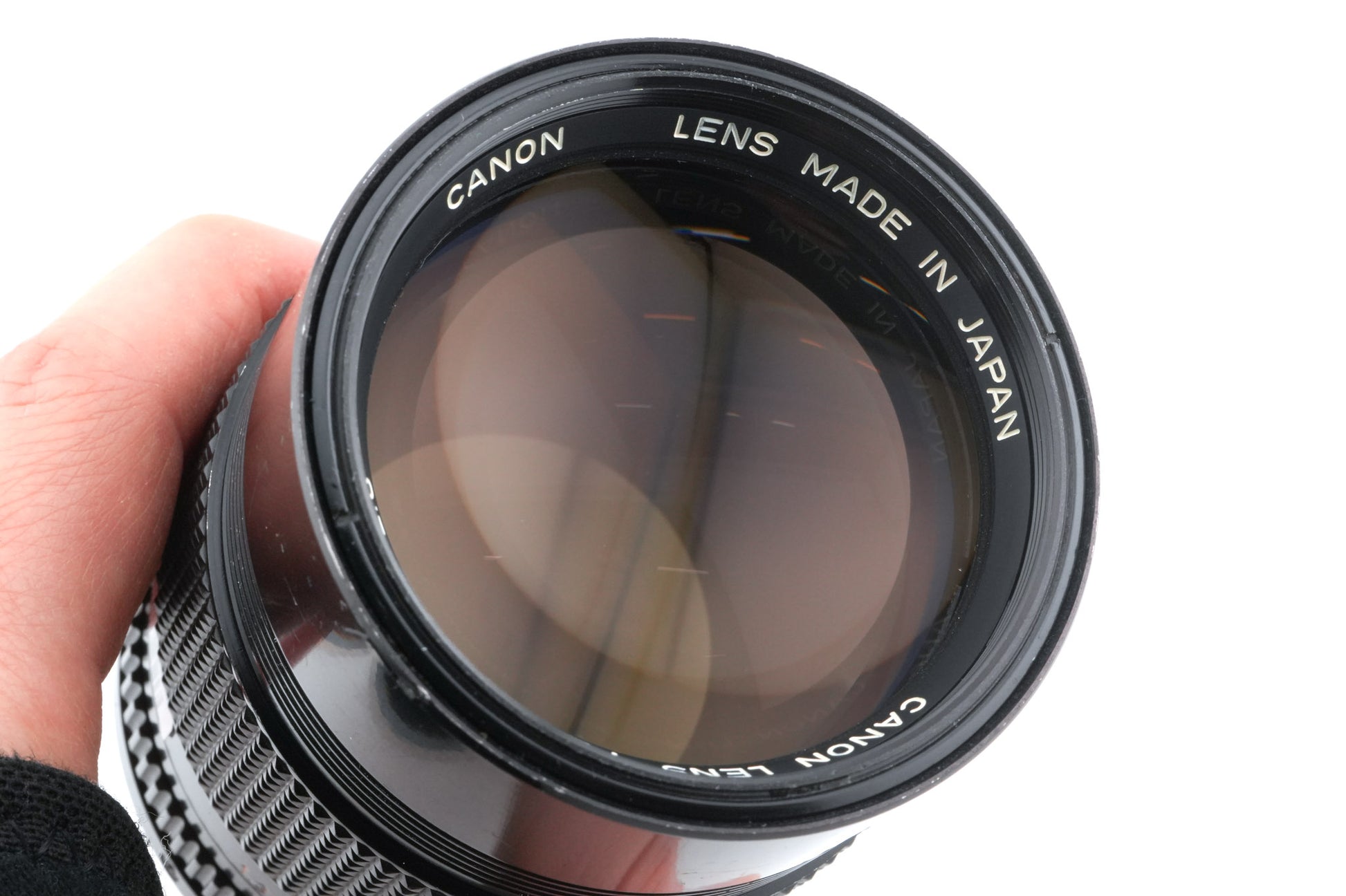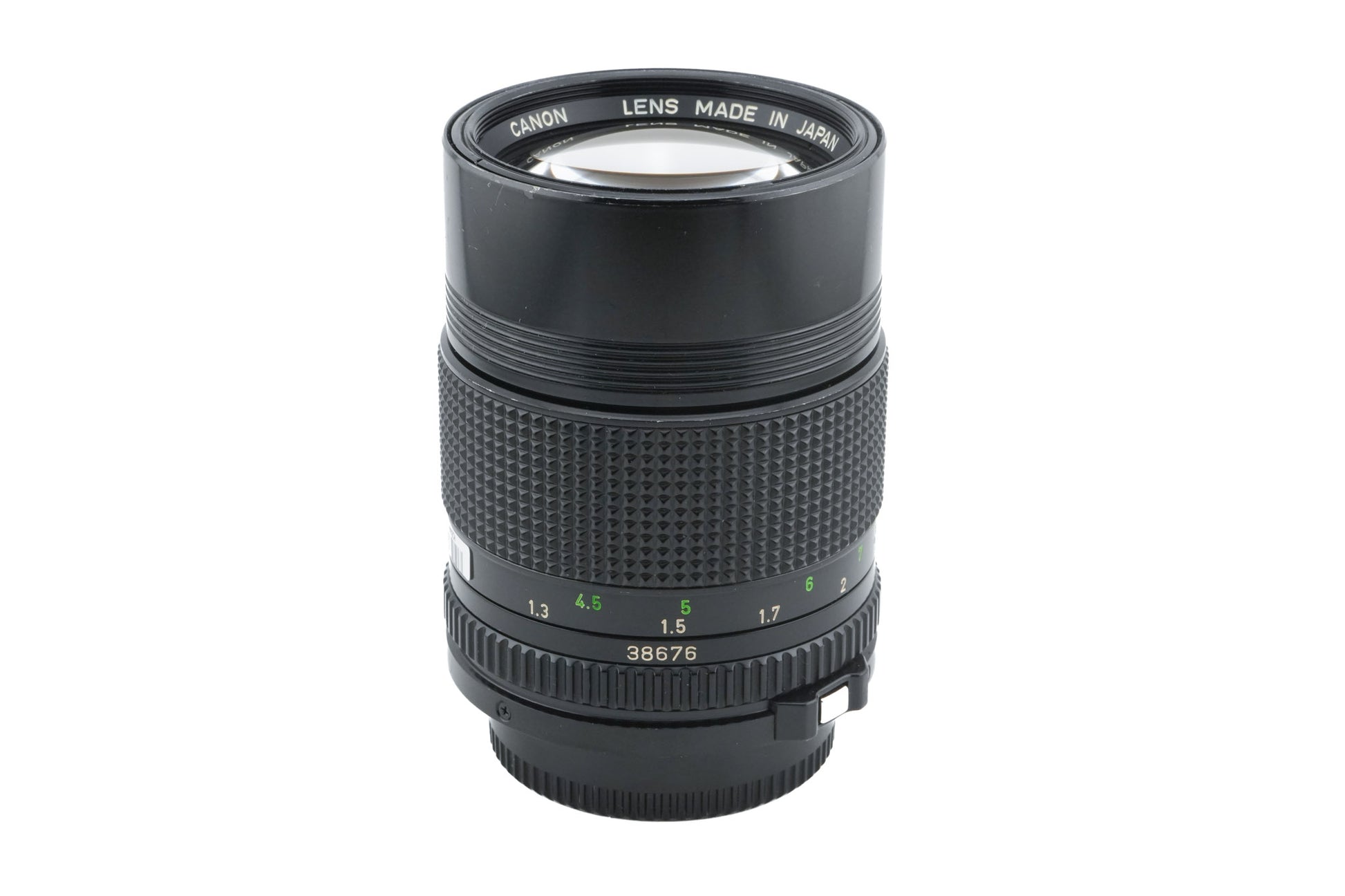 Manual focus telephoto lens made for FD-mount 35mm SLRs by Canon starting in 1979. It uses the newer FDn-style bayonet mounting mechanism and comes with a built-in lens hood. The original price (35,000 Yen) is equivalent to around 350 Euros in 2024. Plastic body available in black.