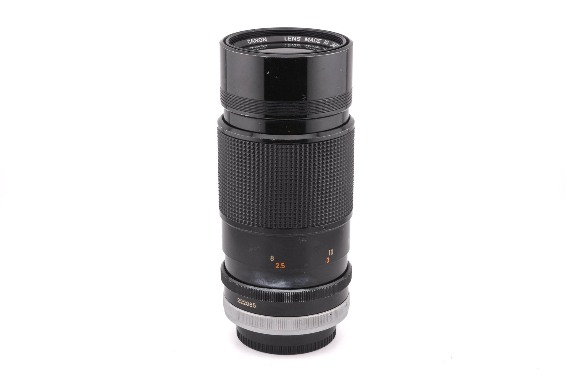 Manual focus telephoto lens made for FD-mount by Canon. It has a built-in lens hood. Metal body available in black.