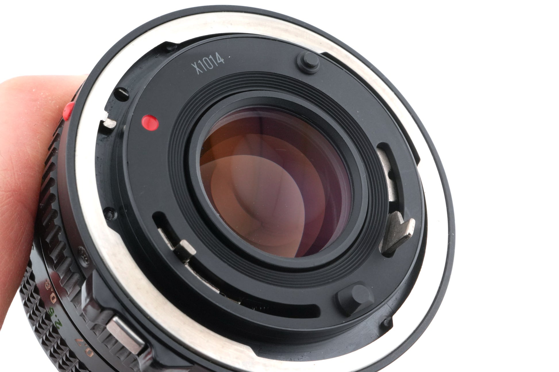 Manual focus normal lens made for FD-mount 35mm SLRs by Canon. It uses the newer style FDn bayonet mounting mechanism. Plastic and metal body available in black.