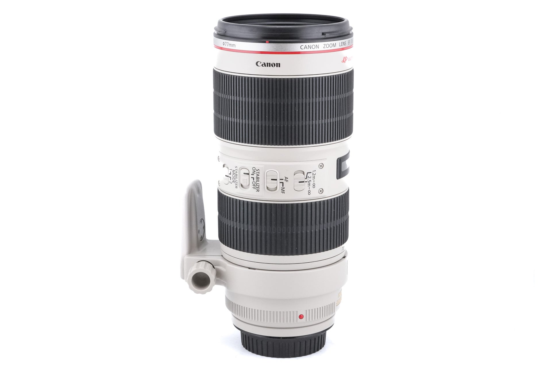 Autofocus telephoto zoom lens made for EF-mount SLR cameras by Canon starting in 2012. It is part of their L series of professional lenses and features a weather-sealing gasket. The lens features an updated image stabilization (IS) system offering four stops of stabilizing power as well as Canon's ultrasonic focusing motor (USM) for autofocus. Metal and plastic body available in beige.