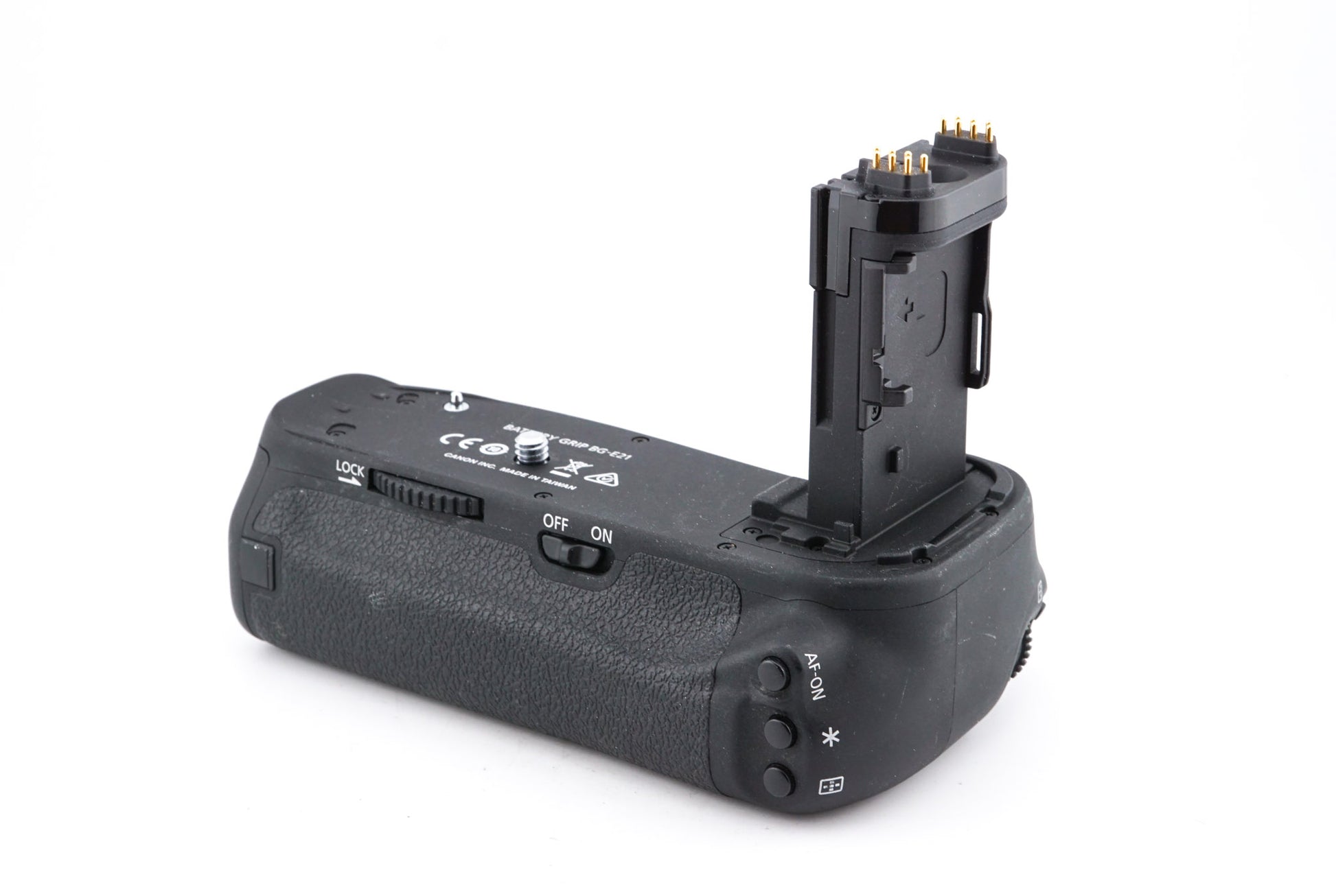 Battery grip made by Canon for the EOS 6D Mark II. It features a vertical shutter release button, AF point selection, main dial, multi-controller, AE/FE lock button, and multifunction button. Plastic body available in black.