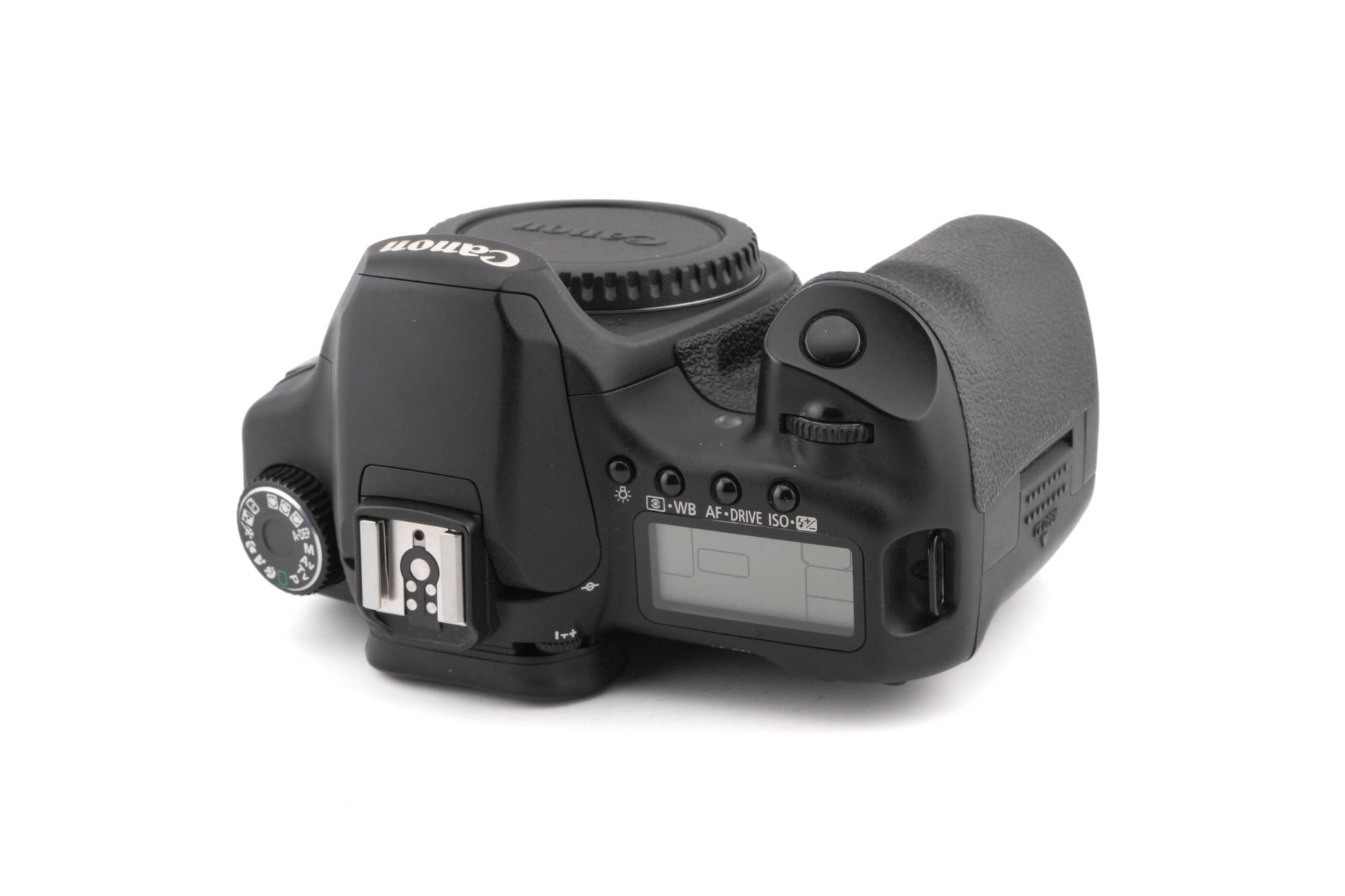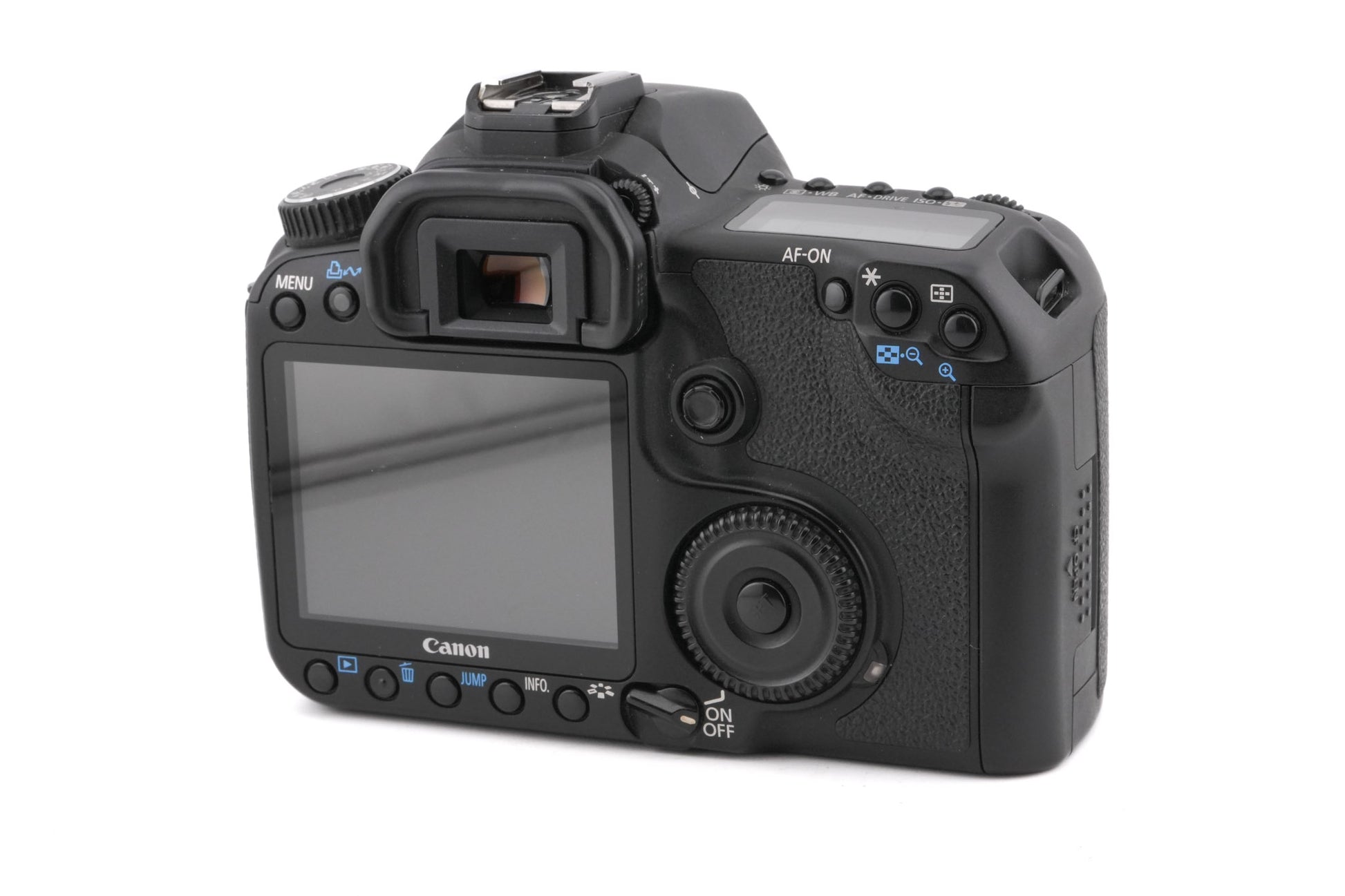Autofocus EF-S mount digital SLR released by Canon in 2007. It has 9 autofocus points, interchangeable focusing screens, a 3" rear screen, and a built-in pop-up flash. It uses Compact Flash (CF) memory cards. Magnesium alloy body available in black.
