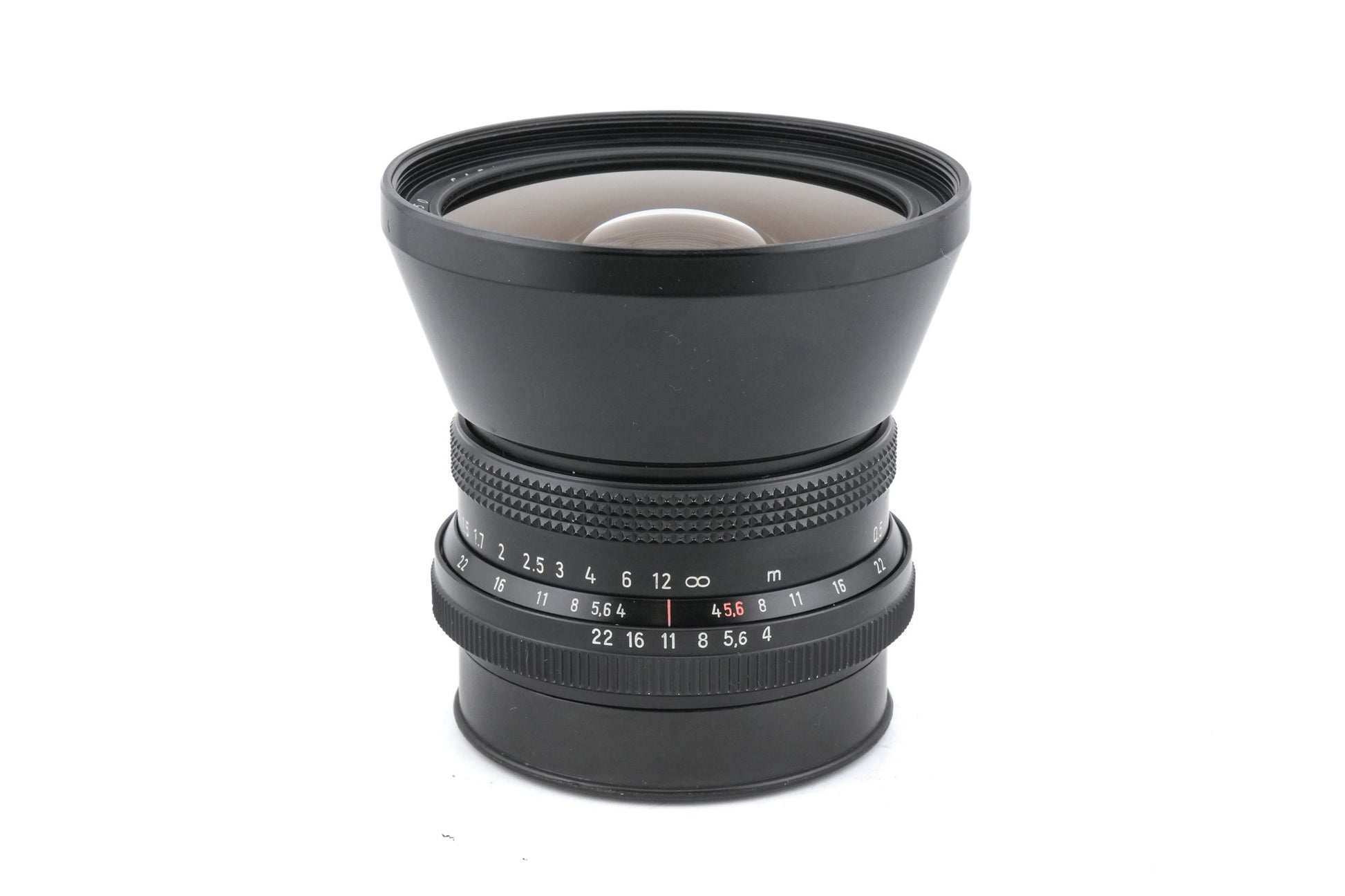 Manual focus wide angle lens made for Pentacon Six mount medium format SLR cameras by Carl Zeiss. Metal body available in black.