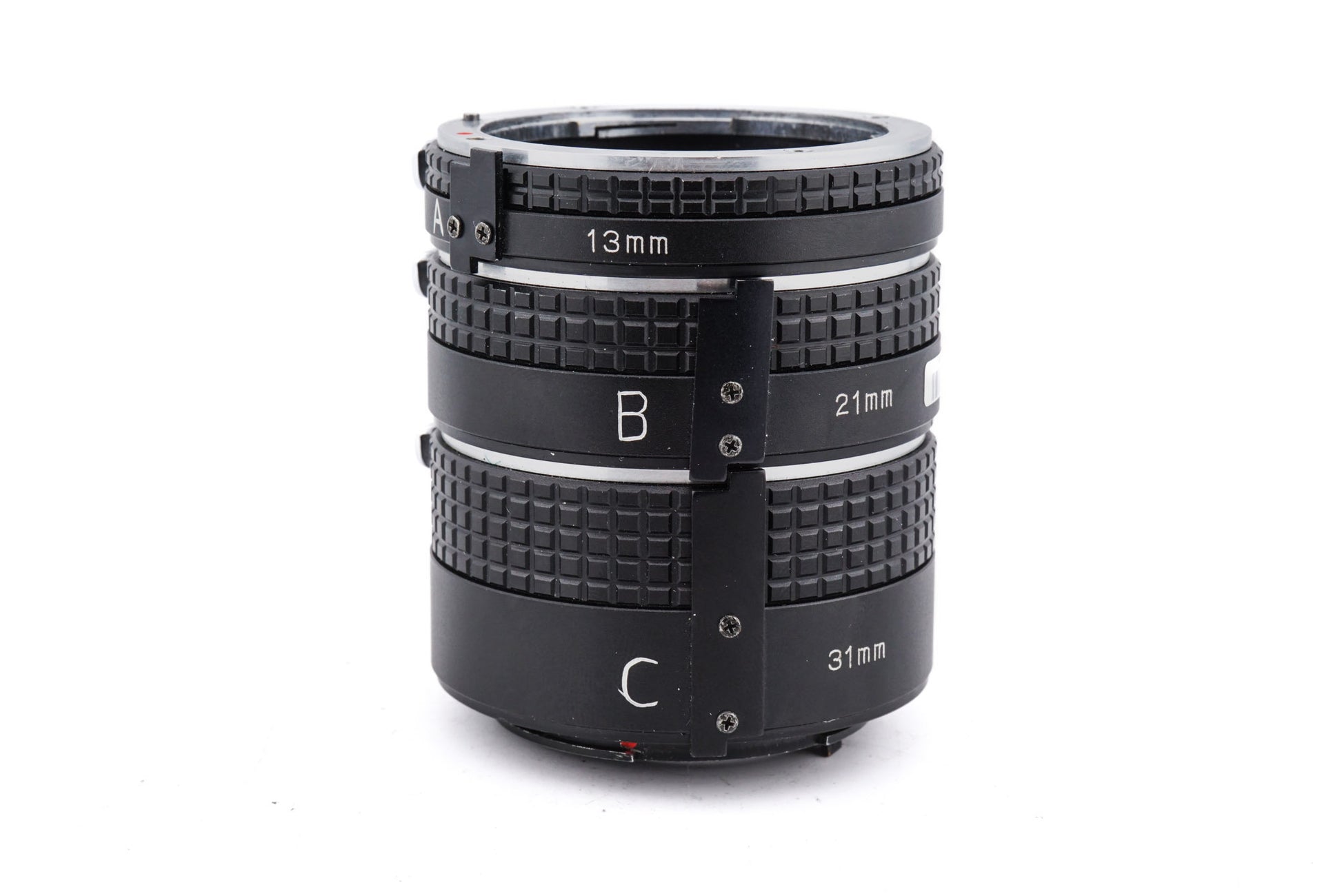 Set of extension tubes made for MD-mount 35mm SLR cameras and lenses. Allows non-macro lenses to be focused much closer while sacrificing the capability to focus to infinity. Multiple different body styles and shapes are available.