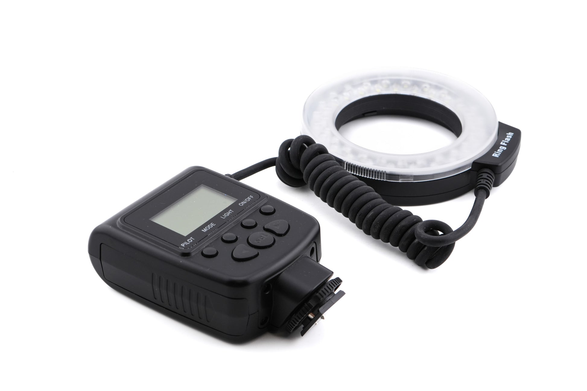 LED ring flash made for digital SLR/mirrorless cameras. Plastic body available in various colors and sizes.