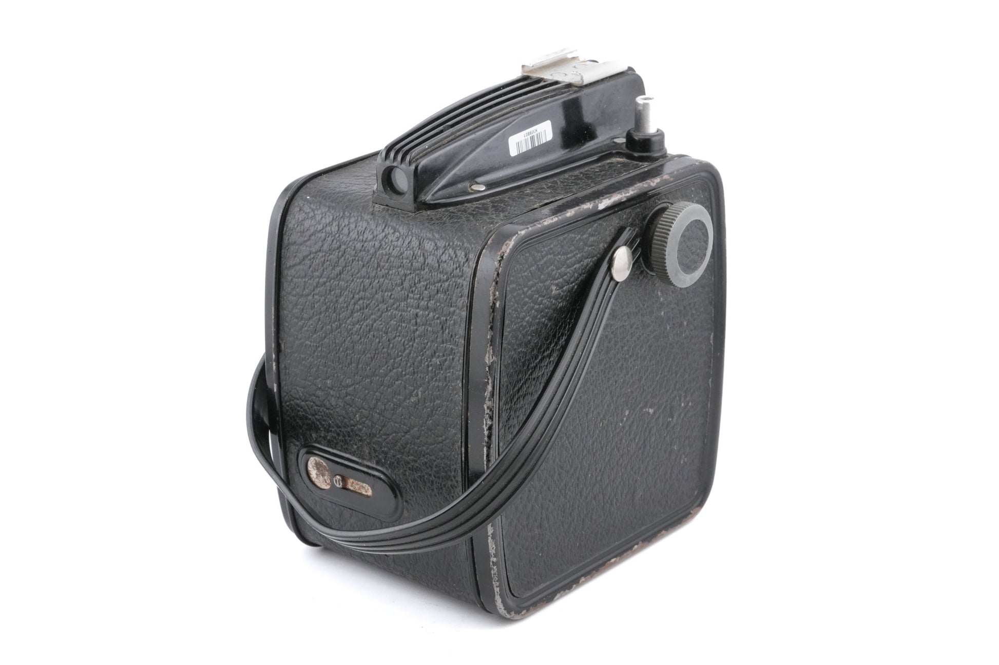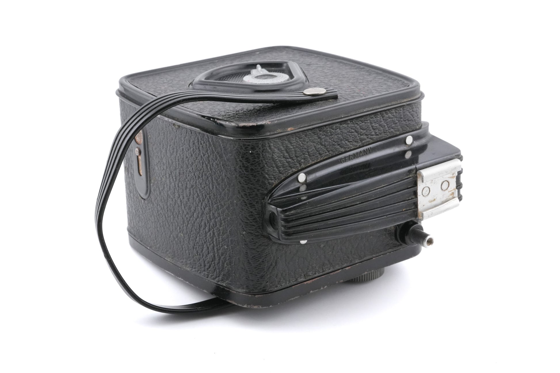 Manual focus medium format viewfinder box camera released by Gevaert around 1951. Capable of taking 6x9 images on 120 film. Metal body available in black.