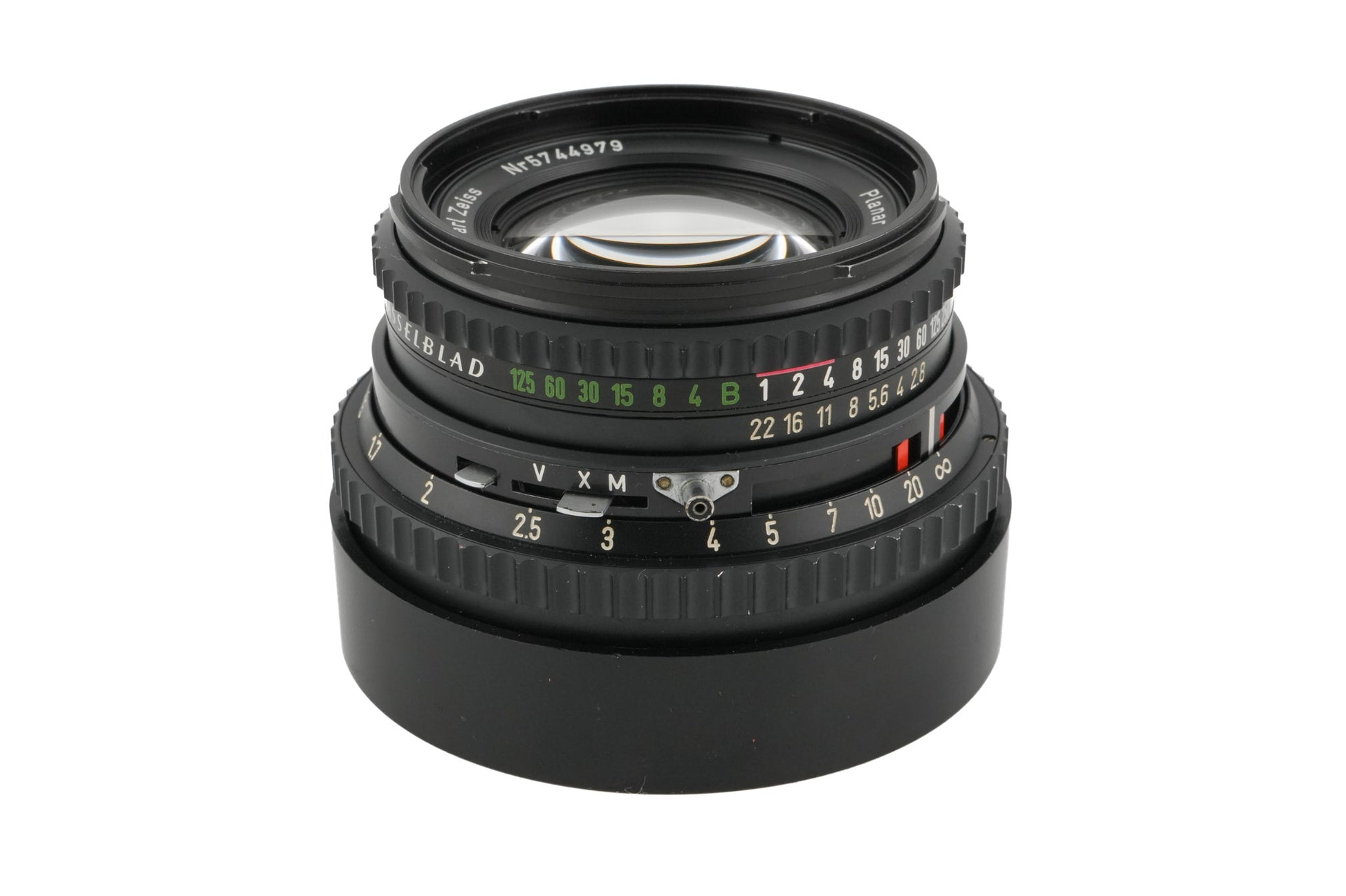 Manual focus normal lens made for V-system 120 SLR cameras by Hasselblad. This is the second "C"-version, which came with a black lens barrel and new T* coatings. Metal body available in black (and a few thousand in silver).