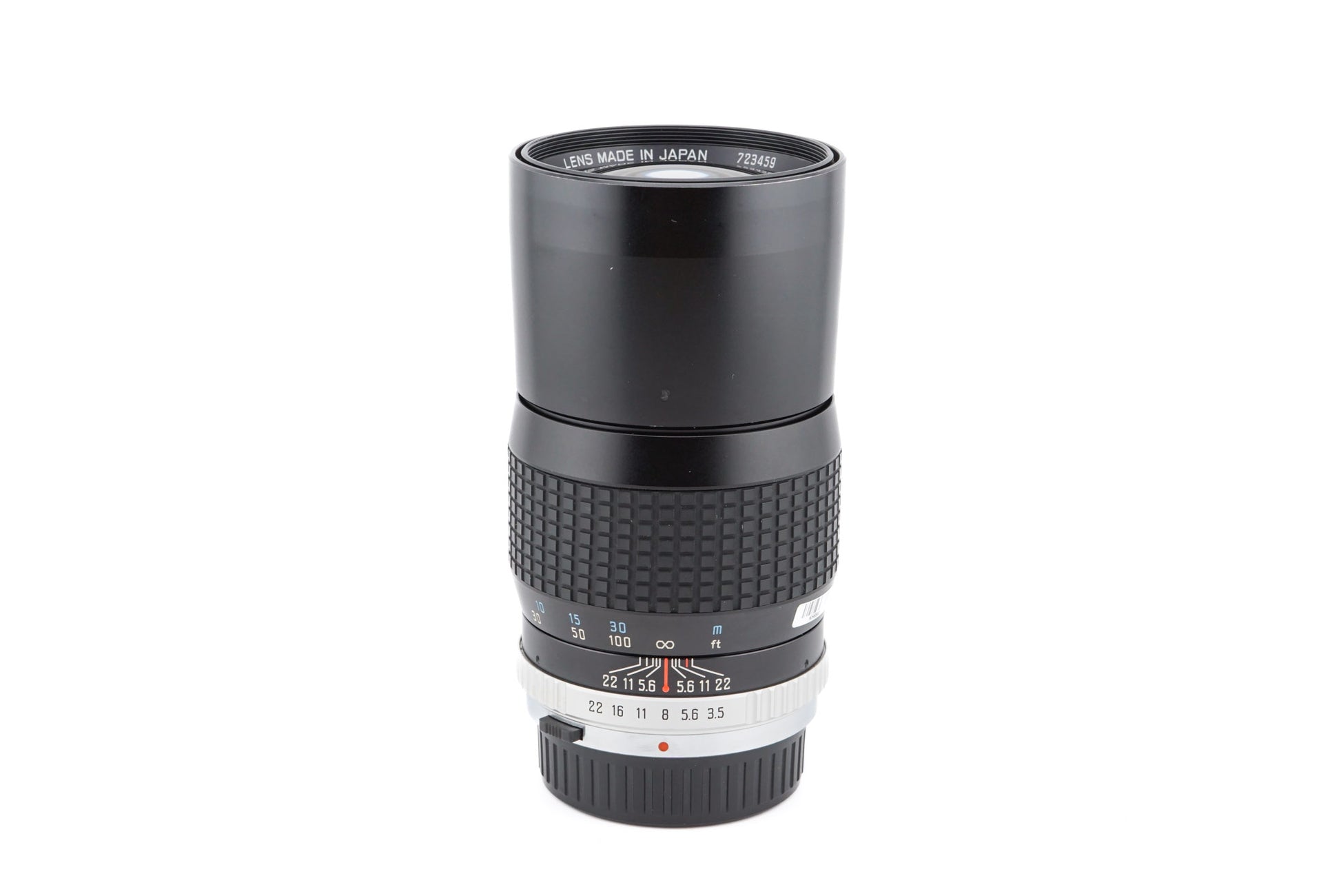 Manual focus telephoto prime lens made for Olympus OM mount SLR cameras by Hoya. Has a built-in lens hood. Metal body available in black.