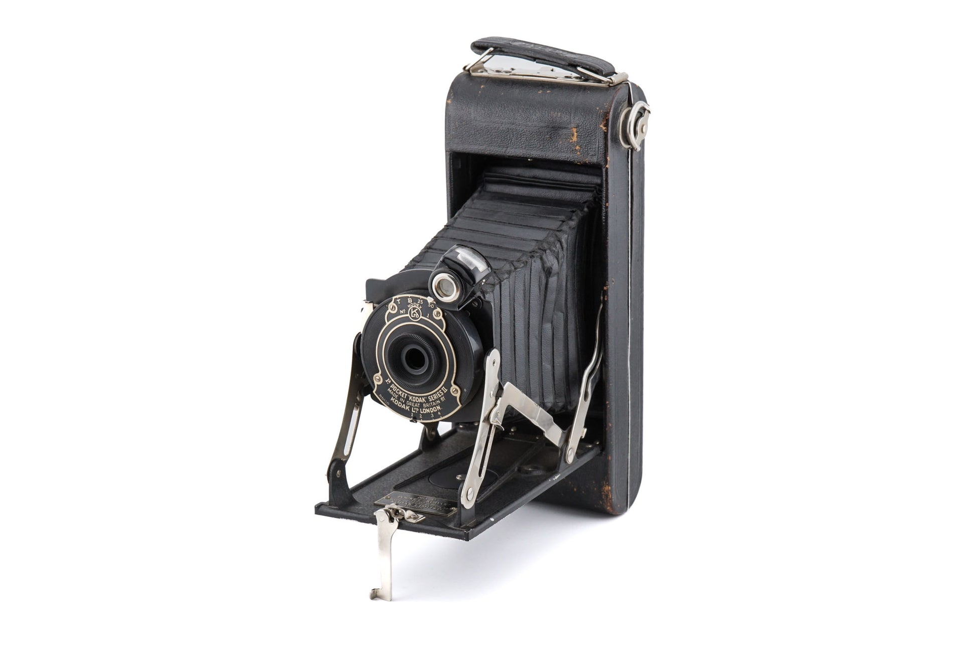 Manual focus 116 roll film folding camera made by Kodak. Metal body available in black.