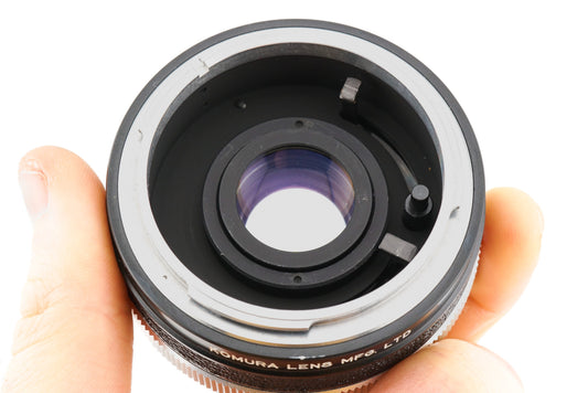 2x Komura teleconverter for Canon FD SLRs. Doubles the focal length and halves the light passing through. Aperture control pass through. Black and silver grey metal body.