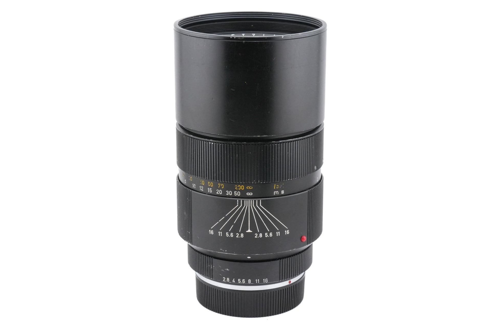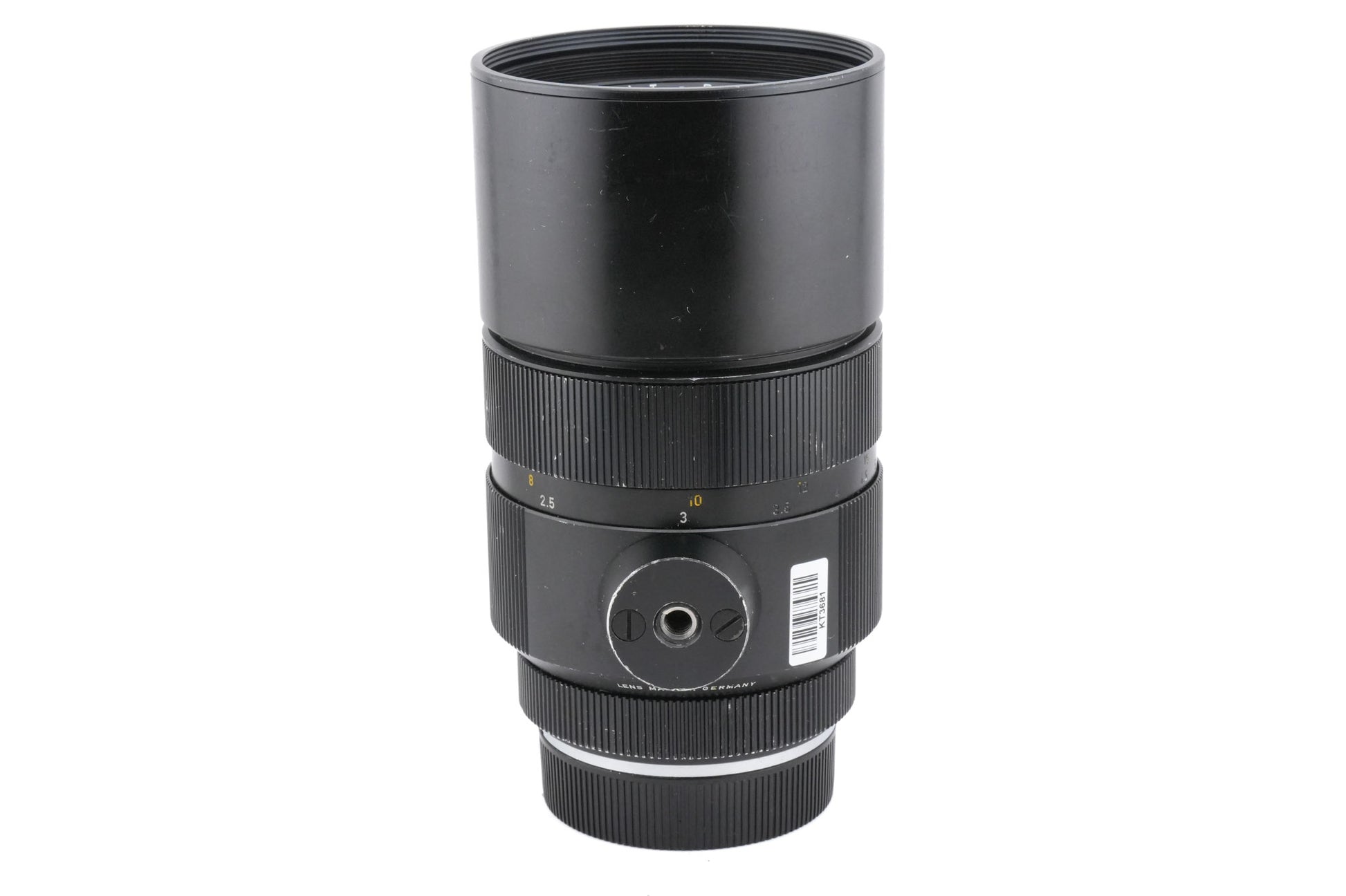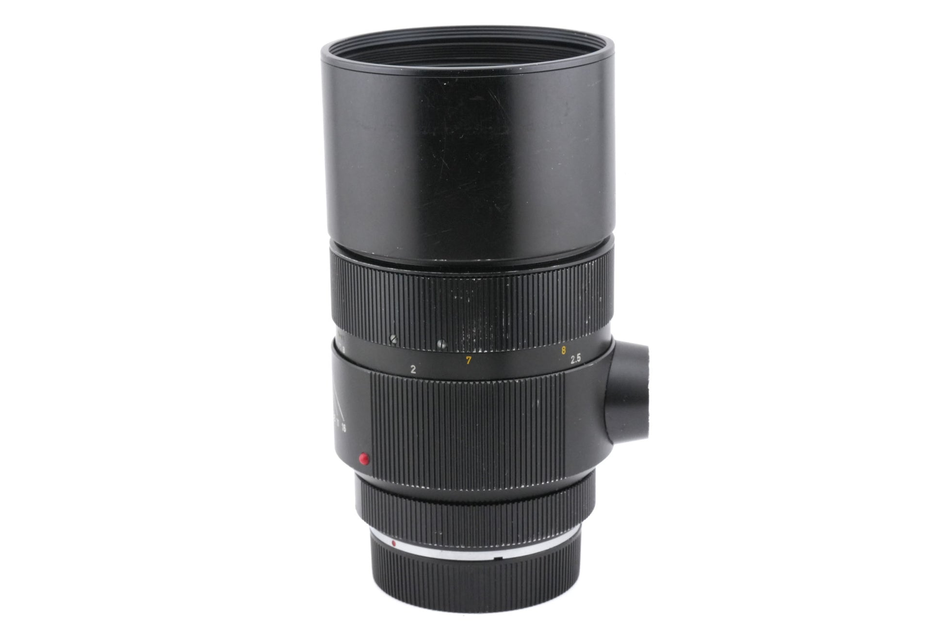 Manual focus telephoto lens made for R-mount 35mm SLR cameras introduced by Leica in 1966. Leica made two versions of this lens. This first version of the lens has a tripod mount and uses Series VIII filters held in place by ring 14165. It has a built-in lens hood and a 14-degree angle of view. It is quite a heavy lens, resulting in Leica extending the tripod base in 1970 by 10mm to ensure optimal support. This lens has a 3-Cam mount. 3-Cam lenses have two sloped cams and a third stepped cam and are compatible with all Leicaflex and R-series cameras. The lens was manufactured both in Germany and Canada. Metal body available in black (11919).