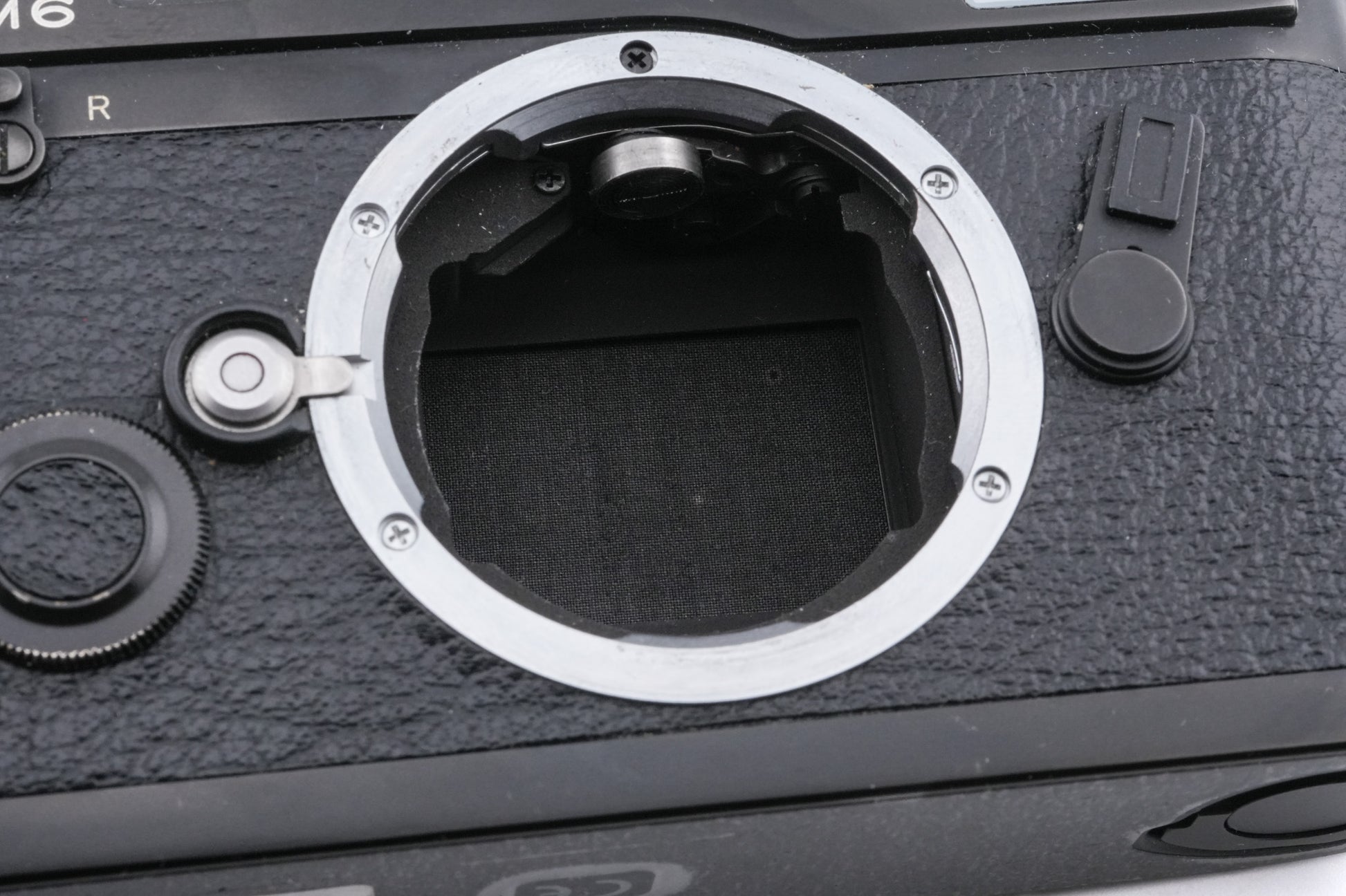 Manual focus M-mount 35mm rangefinder camera introduced by Leica in 1997. The M6 is similar to the M4-P but adds through-the-lens metering. The top cover was changed to a zinc casting making the M6 stronger than the previous M series cameras. At launch, the M6 was only available with a 0.72x viewfinder. This model from 1997 introduced a 0.85x viewfinder making it more suited for lenses 50mm or longer. This change also removed the 28mm framelines. The 0.85x M6 has framelines for 35/135mm, 50/75mm, and 90mm in the viewfinder and was only available in black. Metal body available in black (10413).