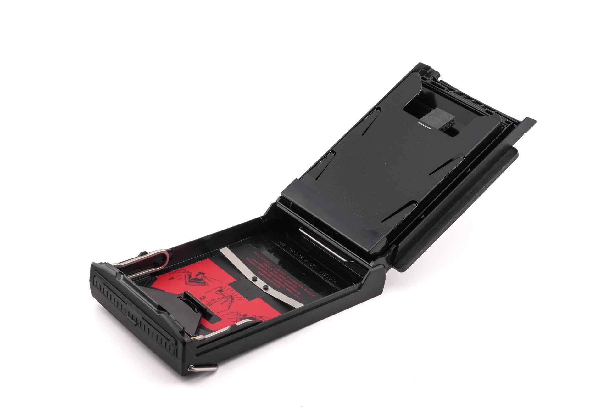 6x9 Polaroid film back for peel-apart film like FP100C introduced by Linhof. Metal and plastic body available in black.