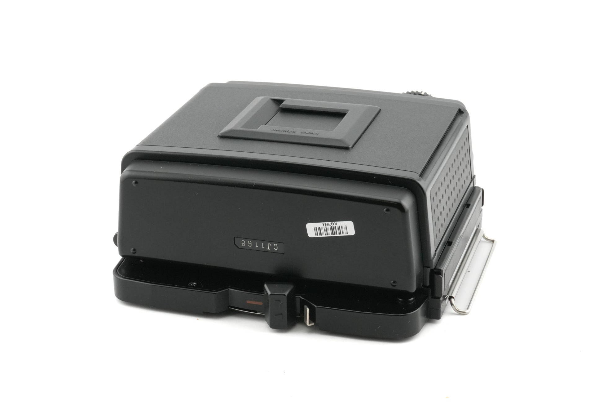 Film back made for RZ67 120 SLRs by Mamiya. This is the second version that added a film memo and dark slide holder. It connects to the body electronically to communicate ISO information. Plastic & metal body available in black.