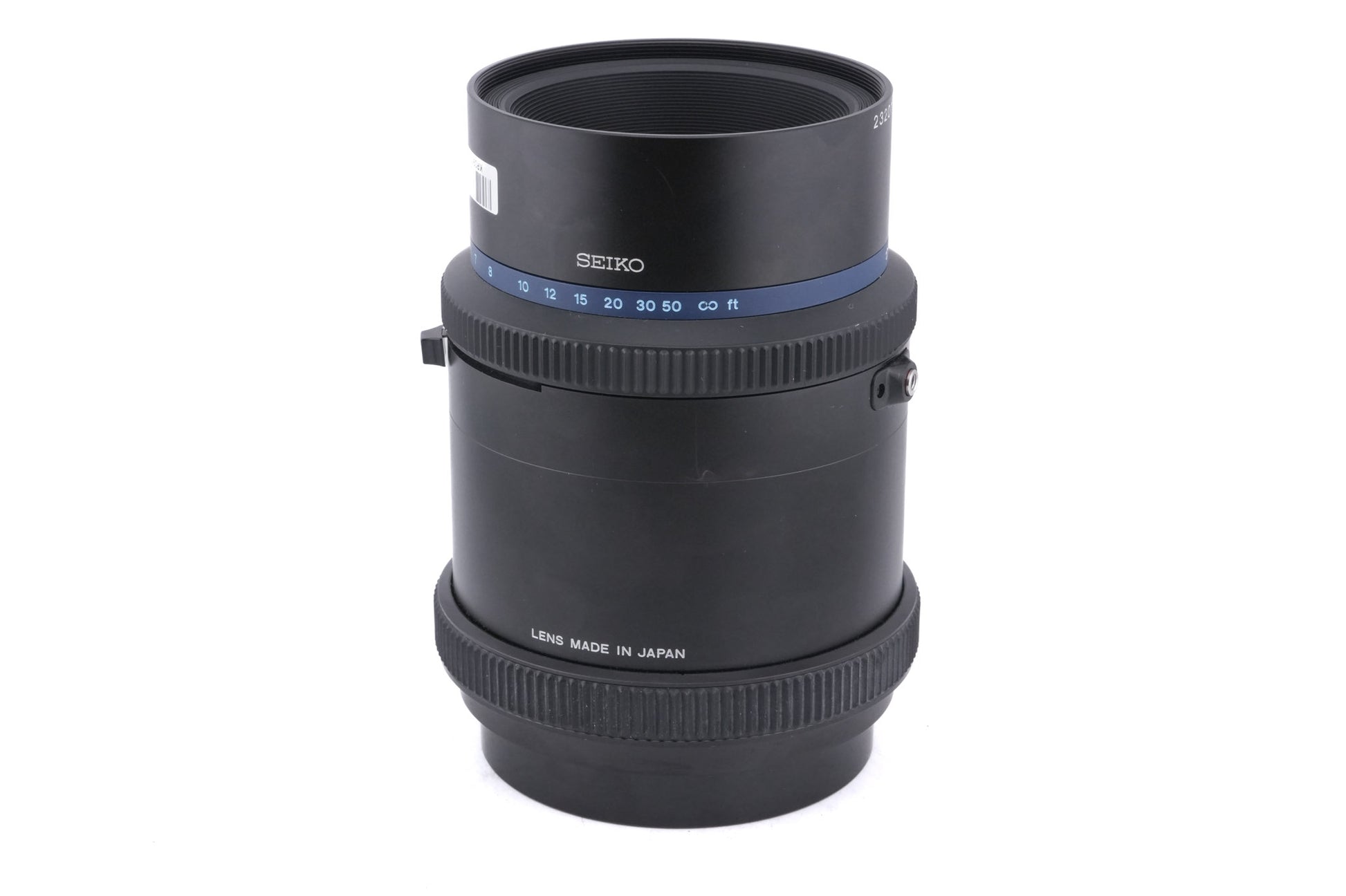 Manual focus telephoto lens made for the Mamiya RZ67 system, introduced by Mamiya. Simple Tessar-type optical design. Built-in Seiko #1 shutter. Metal body available in black finish.