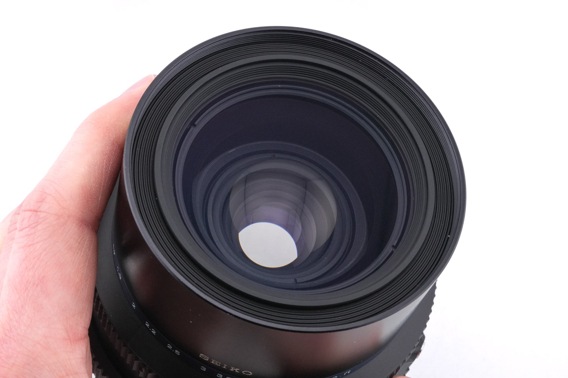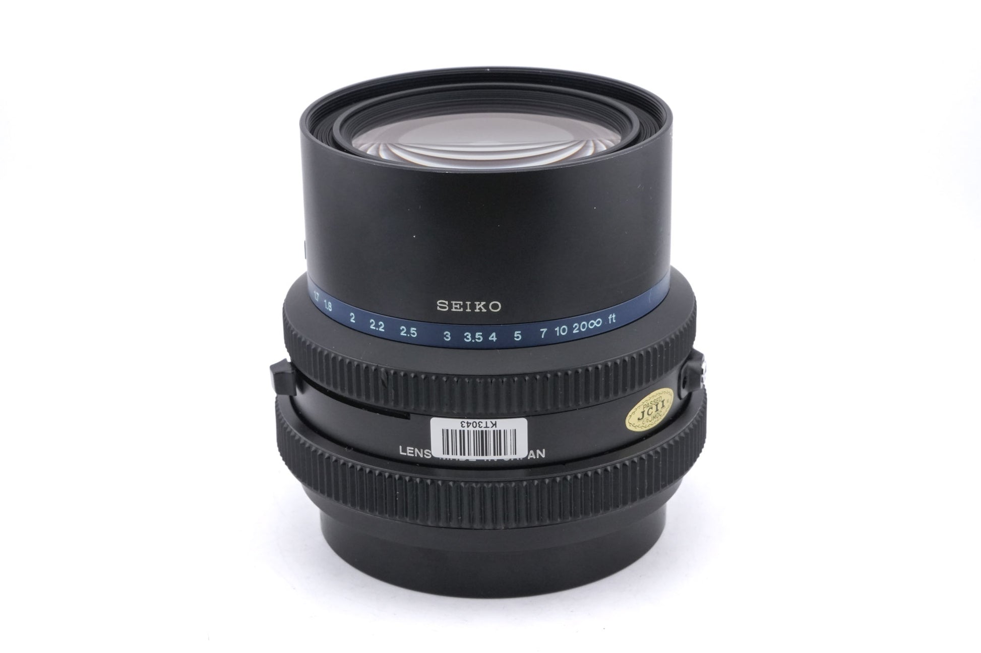 Manual focus wide-angle lens made for RZ67 120 SLRs by Mamiya starting in 1982. The lens gives the equivalent field of view to a 32mm lens on full frame / 35mm (69.5º). This is the newer "W" version with in-between aperture stops. Metal body available in black.