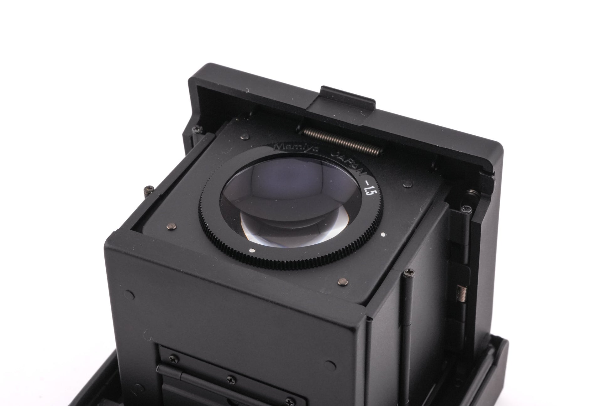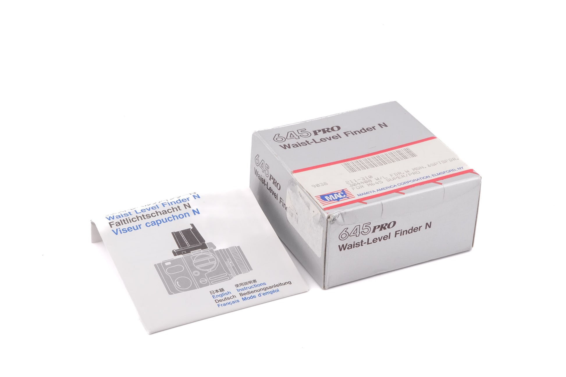 Waist level finder for Mamiya 645 Pro. Features include a magnifier and sports finder. Available in black metal and plastic.
