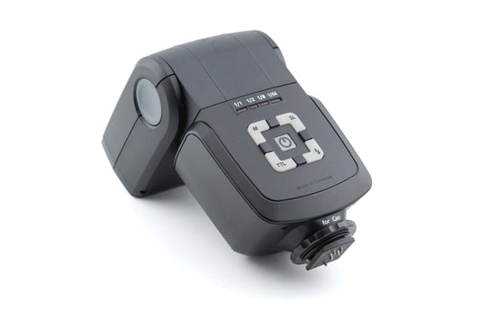Automatic TTL flash made for EF-mount DSLR cameras introduced by Metz. It has an integrated wide-angle diffuser and a zoom range from 24 to 105mm. Plastic body available in black.
