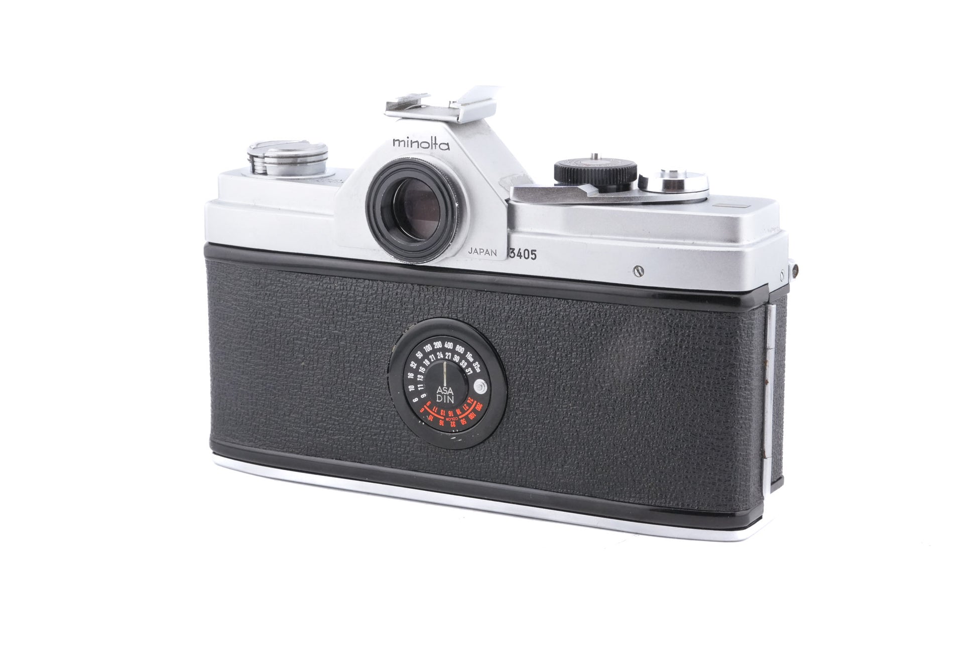 Manual focus 35mm MD-mount mechanical film SLR released by Minolta in 1959. Features mirror lock-up and a self-timer. Metal body available in silver and black.