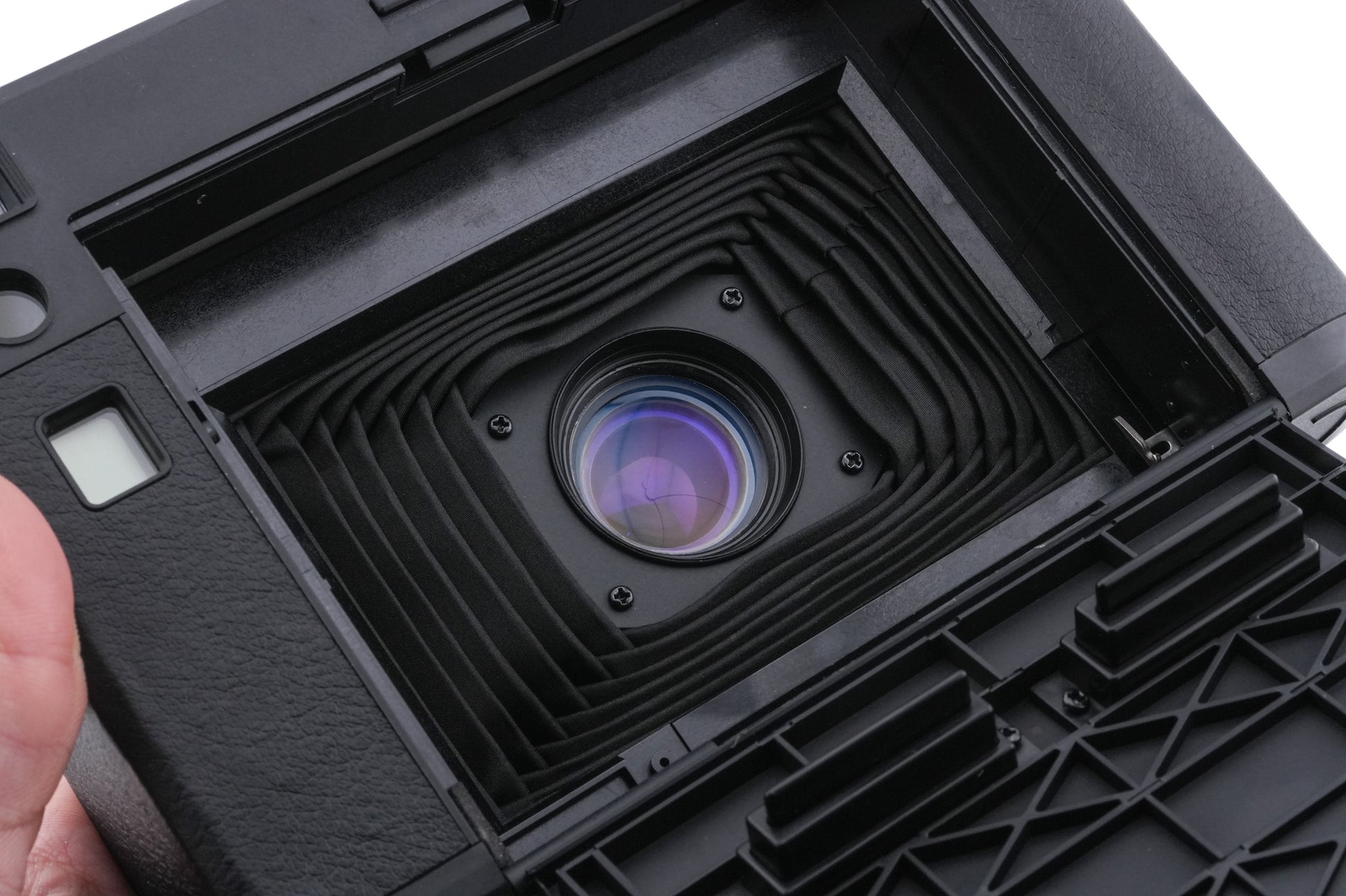 Manual focus Instax wide rangefinder released by Mint. It features a distinct folding design along with both fully manual and automatic capabilities. Plastic body available in black.