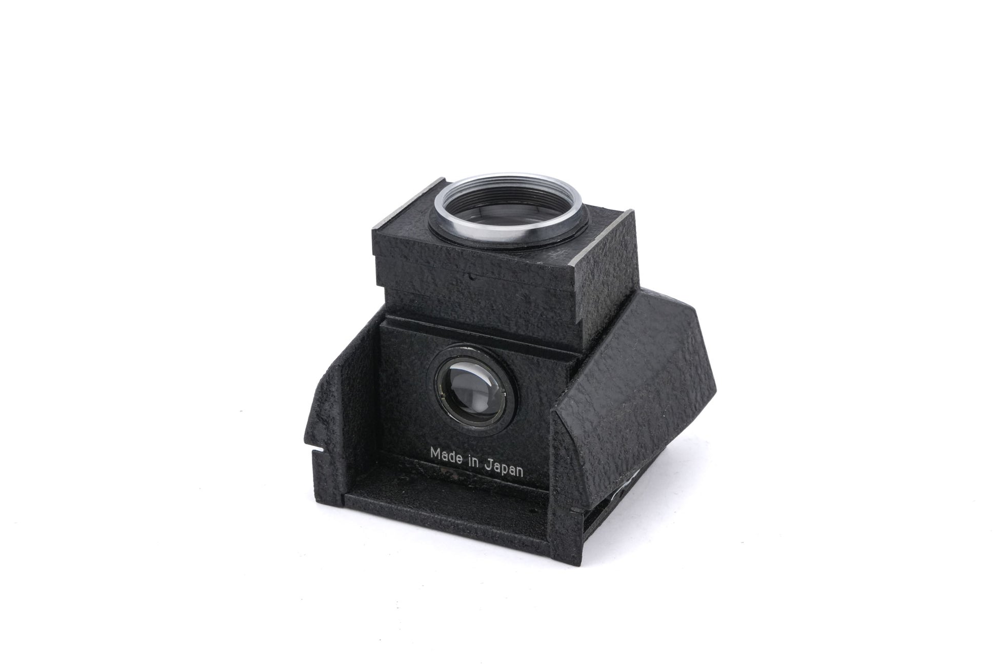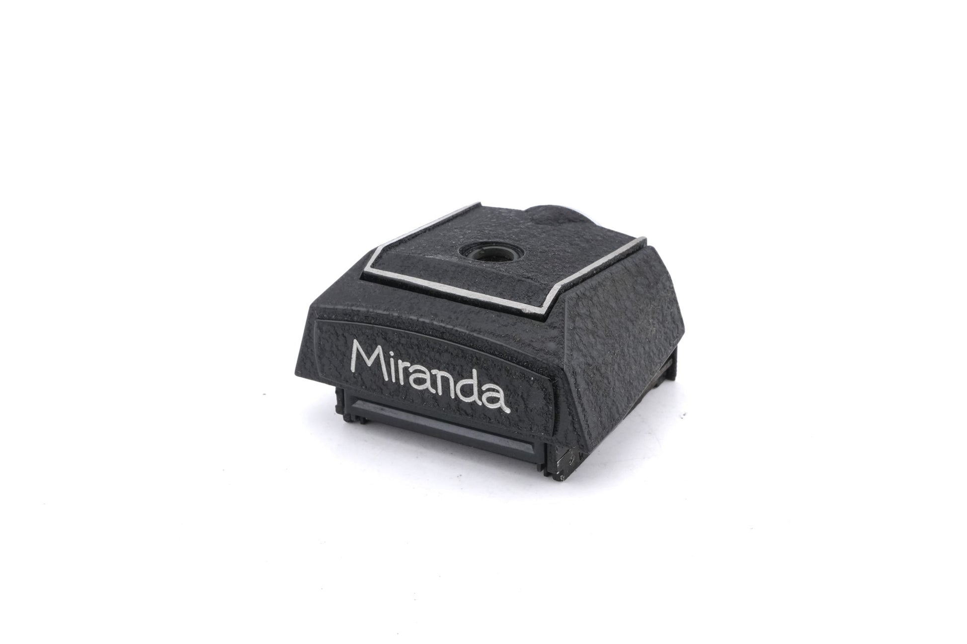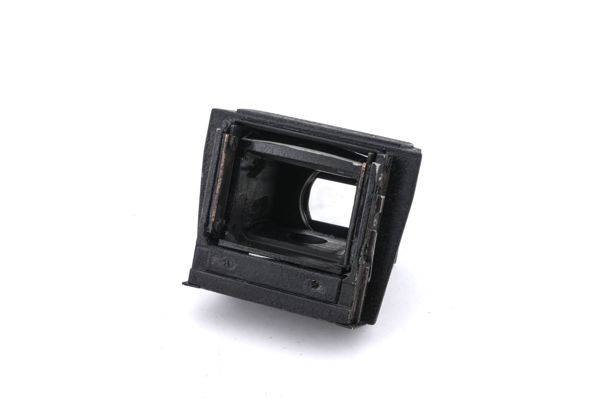 Waist-level viewfinder made by Miranda. It has two magnification ratios and flips up to change between them. Ratios are 5x and x15. Metal body in black finish.