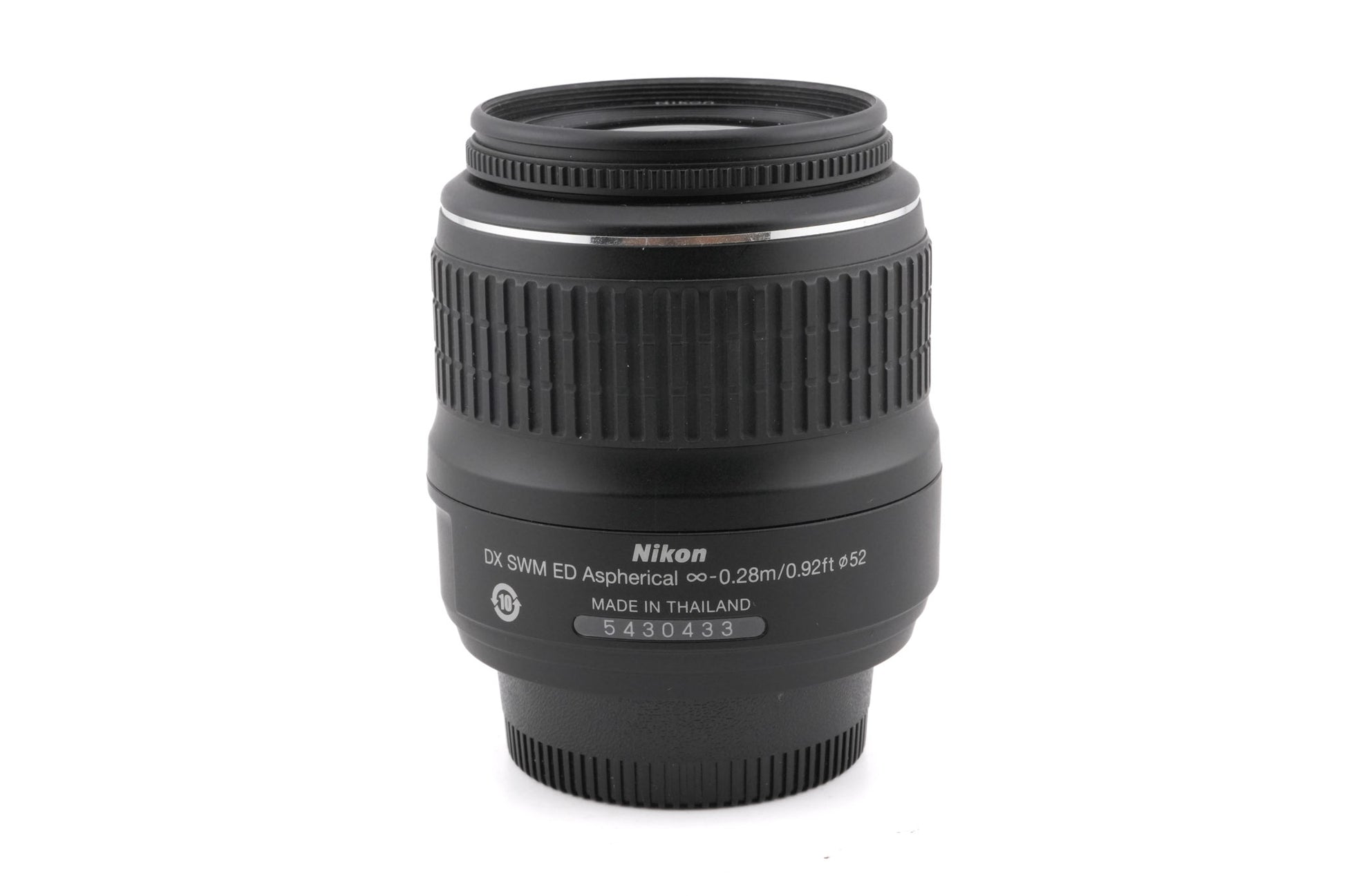 Autofocus standard zoom lens made for DX-mount digital SLRs by Nikon. It is designed for APS-C-sized sensors and gives the equivalent field of view to a 27-82.5mm lens on full frame/35mm. This is the kit lens for many early Nikon DX-mount cameras. Plastic body available in black.