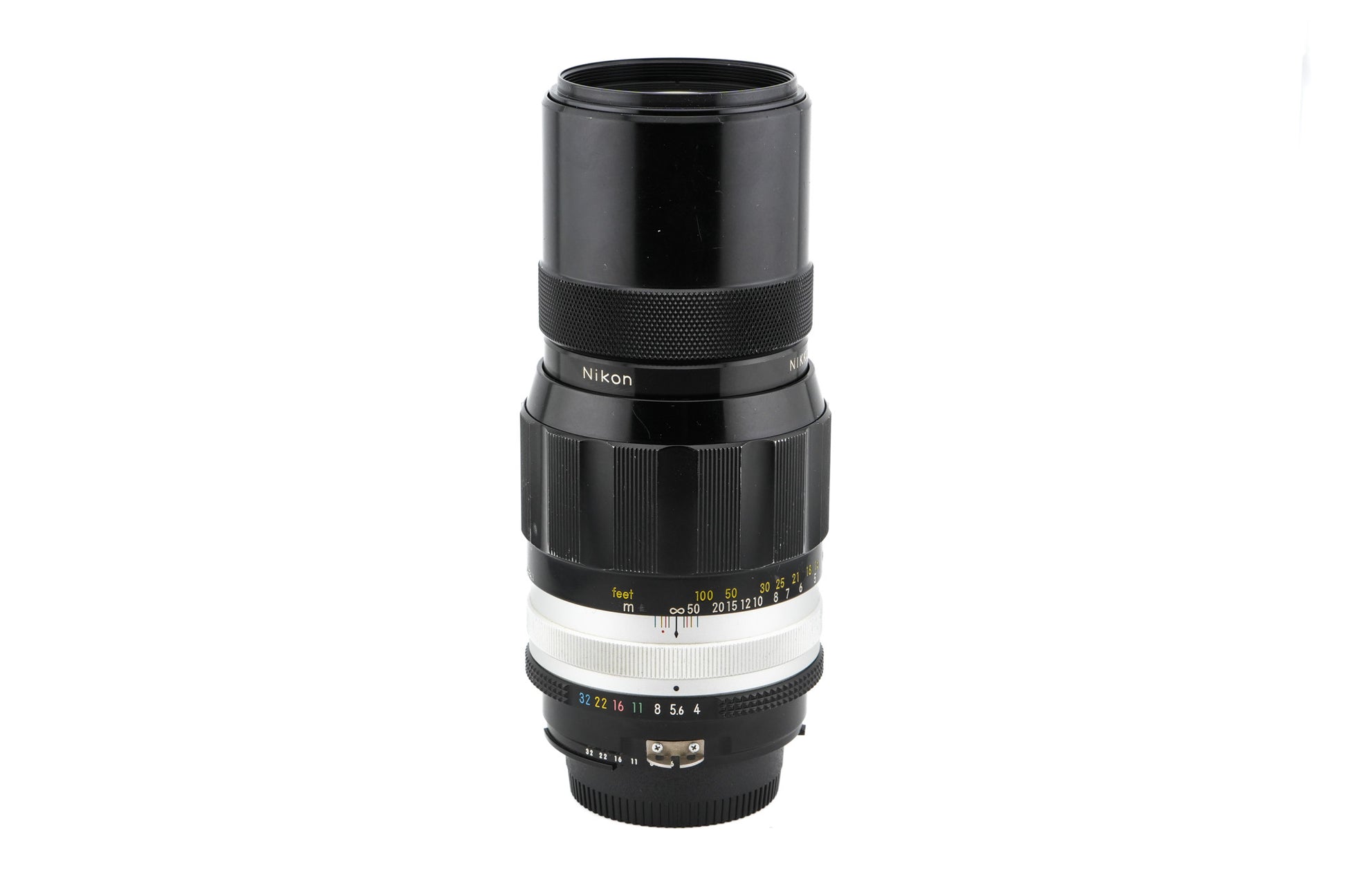 Manual focus telephoto lens made for F-mount 35mm SLR cameras manufactured from 1961 to 1976 by Nikon. This lens has been updated to have an AI ridge. It has a built-in lens hood. Metal body available in black.