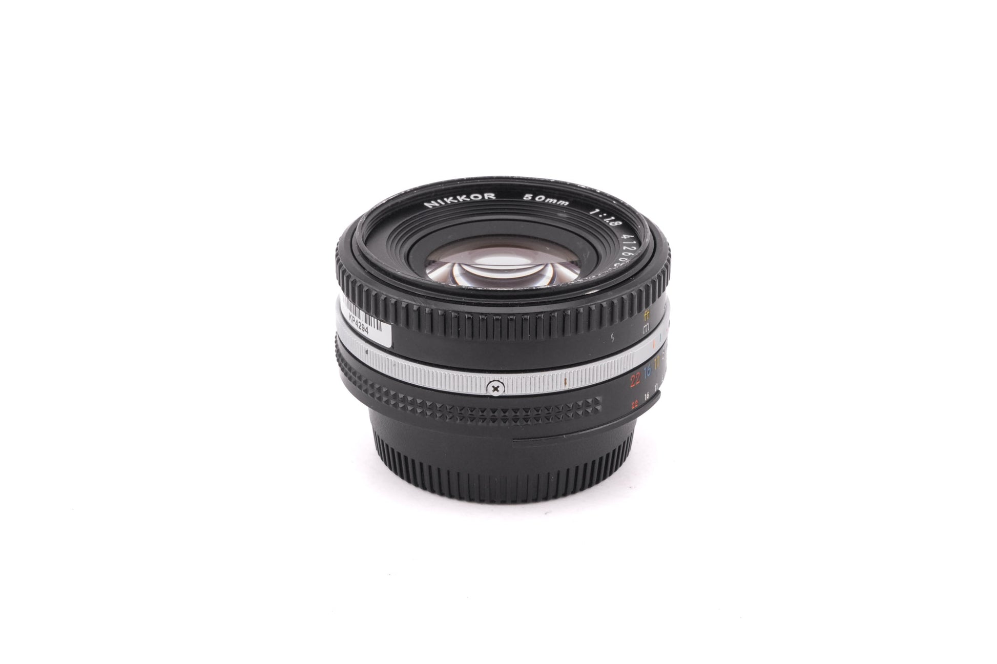 Manual focus normal lens made for F-mount 35mm SLRs by Nikon. This is the North American version of the similar silver-ring 50mm f1.8 Series E lens. It has no bunny ears but has the AI ridge and AI-S indent so it will meter properly on most manual Nikon cameras (excluding F, F2, and Nikkormats) and will work with the advanced program modes of later cameras. Plastic body available in black.